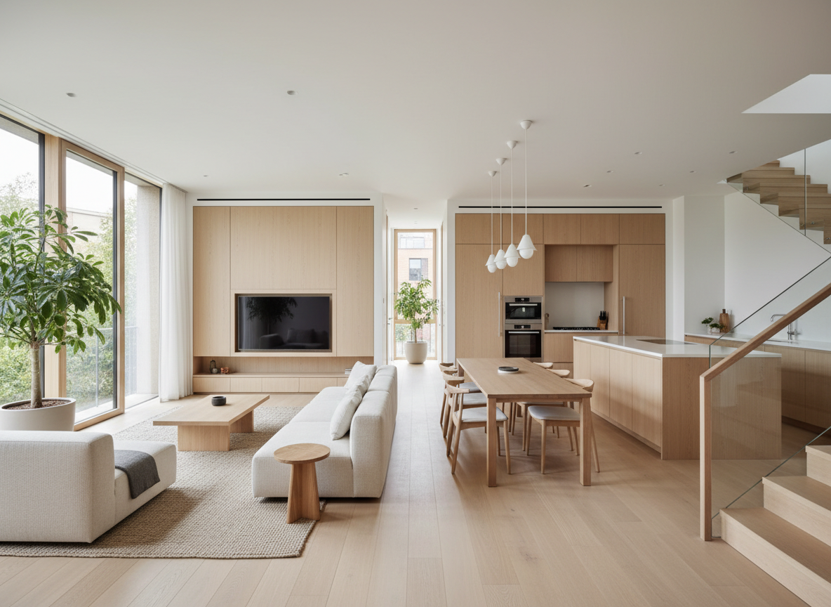 Nhà phố phong cách Scandinavian tại Thủ Đức với màu gỗ sáng – trắng nhẹ nhàng, mang lại cảm giác thoáng mát và yên bình.
