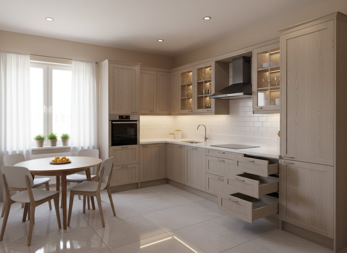 Vật liệu MDF chống ẩm, HDF cao cấp, gỗ sồi tự nhiên, đá nhân tạo, kính cường lực… đều là những lựa chọn phổ biến cho công trình nhà phố. Ngoài ra, phụ kiện đi kèm như bản lề giảm chấn, ray trượt, tay nắm… cần được lựa chọn từ những thương hiệu uy tín để đảm bảo tuổi thọ lâu dài.