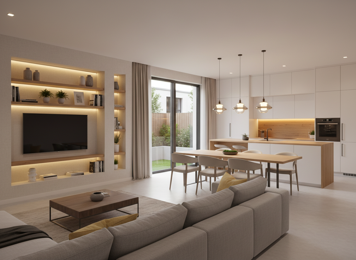 Nhà phố hiện đại 1 trệt 2 lầu tại Quận 7 với thiết kế tinh gọn, tông màu trung tính và hệ tủ âm tường tối ưu diện tích.