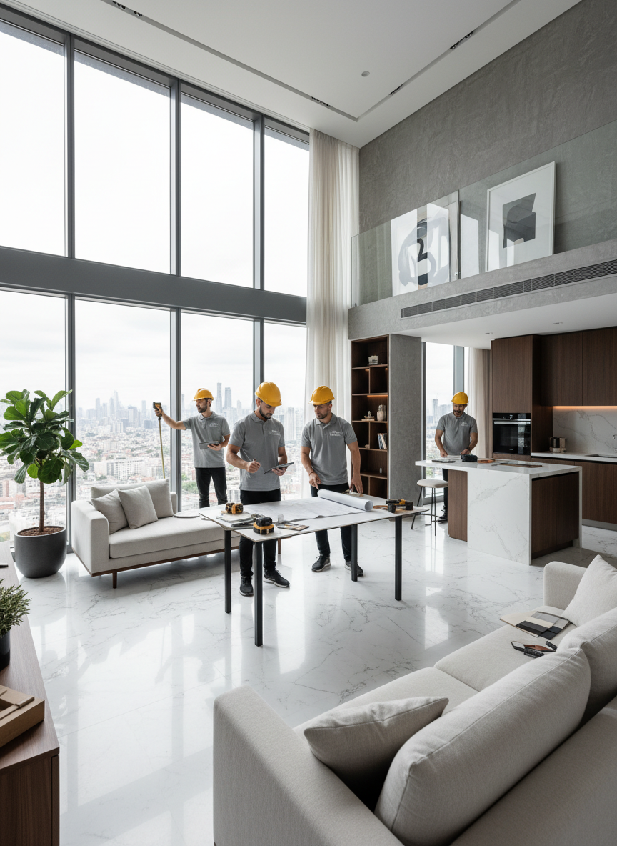 Đội ngũ kỹ thuật trực tiếp đến căn hộ đo đạc chi tiết kích thước thực tế, kiểm tra hệ thống điện nước, kết cấu tường, trần.