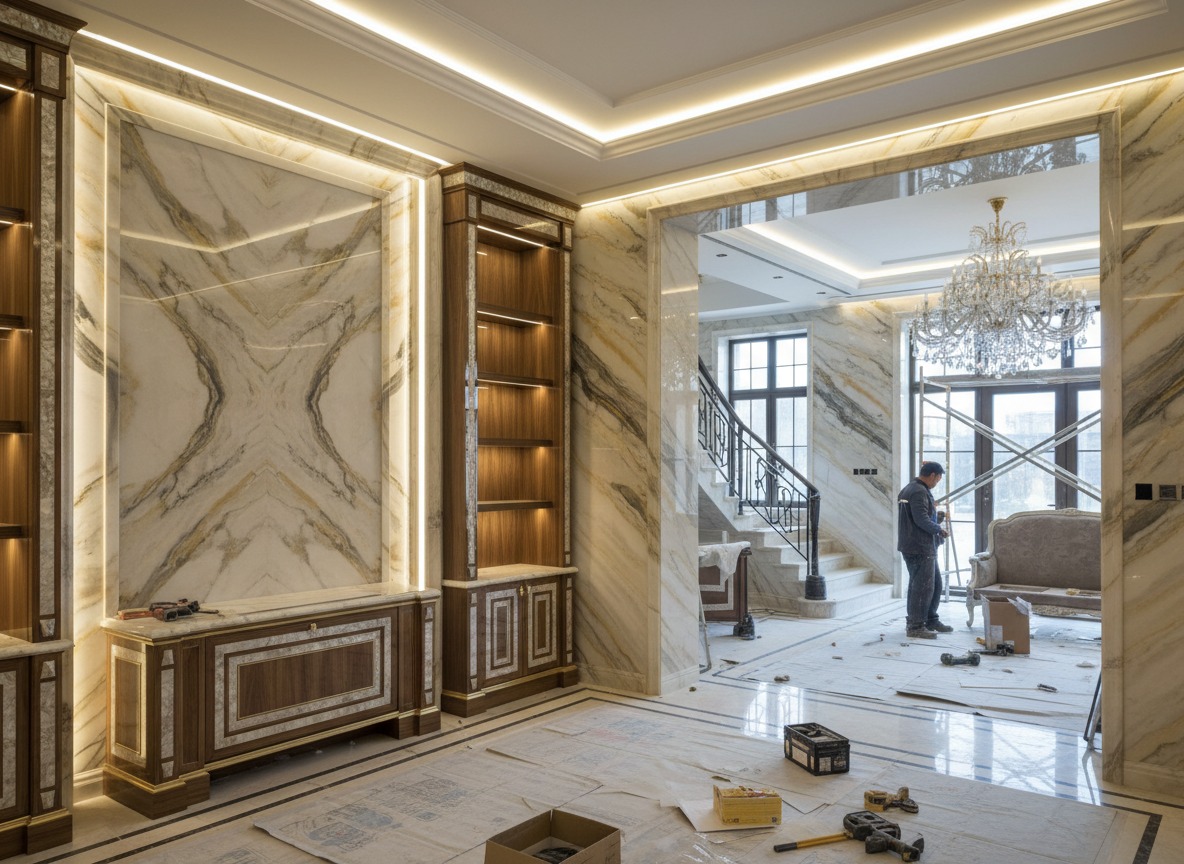 Phong cách luxury sử dụng vật liệu cao cấp như đá tự nhiên, veneer cao cấp, kính màu, đèn led, hệ tủ ánh kim và màu sắc sang trọng; thi công phong cách này cần sự đồng bộ, chính xác tuyệt đối, vật liệu chuẩn loại và kỹ thuật lắp đặt chuyên nghiệp.