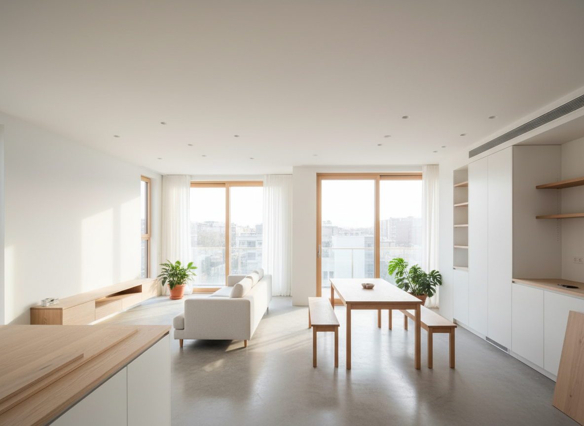 Phong cách tối giản hướng đến sự gọn gàng, ít chi tiết, đường nét thẳng và màu sắc trung tính; tuy ít chi tiết nhưng lại cực kỳ khó thi công vì chỉ cần một đường nối không thẳng hoặc một góc bo không kín cũng đủ làm không gian mất thẩm mỹ; vì vậy cần công ty có đội ngũ giám sát và thợ tay nghề cao.