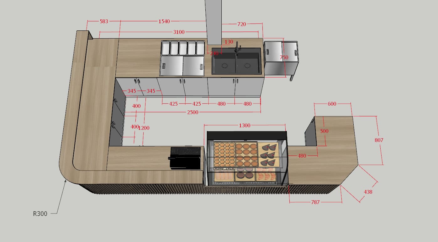 Quầy cần được thiết kế vừa tầm sử dụng, đảm bảo độ an toàn về điện, nước, đặc biệt khi có nhiều thiết bị hoạt động đồng thời.