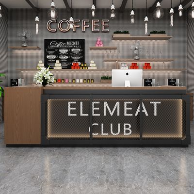 Chất liệu gỗ kết hợp đá nhân tạo, tích hợp máy pha cà phê tự động, có không gian trưng bày ly và bánh ngọt. Phù hợp với mô hình quán take-away hoặc cafe nhỏ.