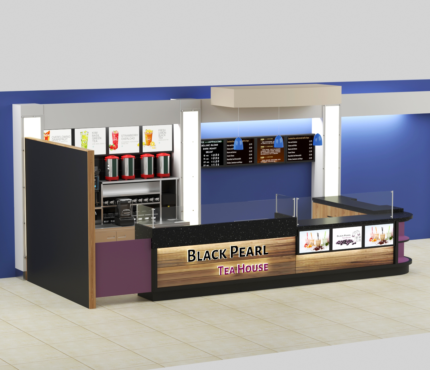 Sử dụng màu pastel hoặc màu thương hiệu, thiết kế đơn giản nhưng đầy đủ máy móc như máy dập nắp, máy lắc, máy sealer, tủ lạnh và ngăn topping. Phù hợp với mô hình chuỗi cửa hàng trà sữa.