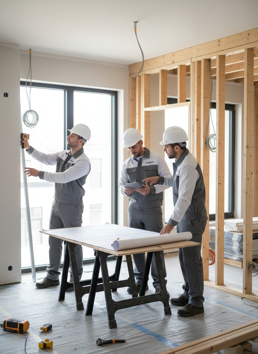 Đội ngũ kỹ thuật đến trực tiếp công trình để đo đạc, kiểm tra mặt bằng, hiện trạng tường – sàn – trần, vị trí ổ điện, đường nước, độ phẳng tường và các yếu tố liên quan.