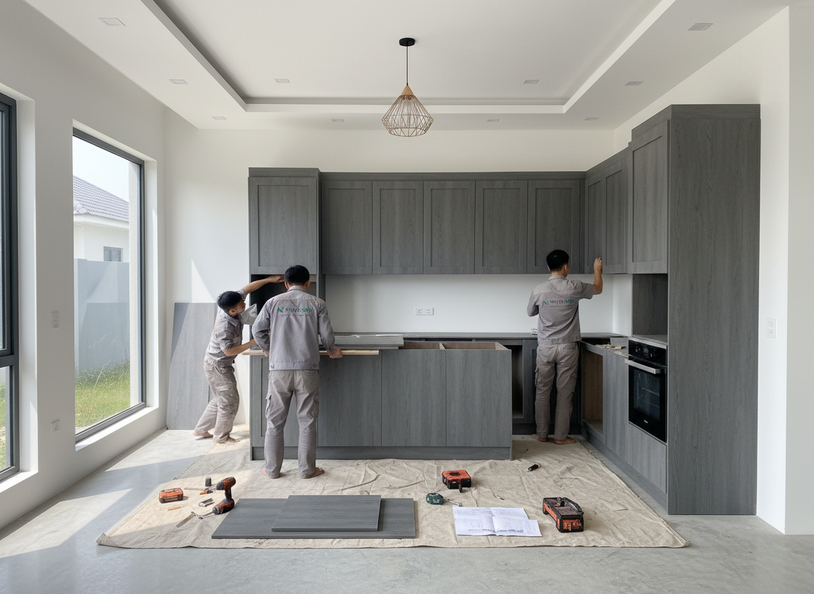 Đội ngũ thợ thi công giàu kinh nghiệm sẽ tiến hành lắp đặt theo đúng bản vẽ đã duyệt; quá trình này đòi hỏi sự tỉ mỉ, chính xác và gọn gàng để đảm bảo sản phẩm hoàn thiện đạt thẩm mỹ cao, không trầy xước, không lệch kích thước và phù hợp tuyệt đối với không gian thực tế; ngoài ra đội giám sát sẽ theo sát từng giai đoạn để đảm bảo tất cả hạng mục đều đúng tiến độ và tiêu chuẩn.
