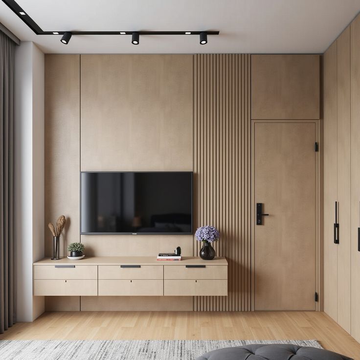 Ngoài ra, kệ tivi plywood kết hợp vách ốp tường đang được nhiều kiến trúc sư lựa chọn trong các dự án cao cấp. Sự kết hợp này tạo nên một mảng tường liền mạch, sang trọng, đồng thời giúp không gian phòng khách trở nên nổi bật và có chiều sâu hơn. Các đường vân gỗ tự nhiên của plywood khi kết hợp ánh sáng LED trang trí cũng mang lại hiệu ứng thị giác rất ấn tượng.