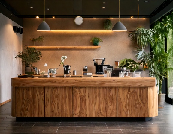 Đối với phân khúc cao cấp, khách hàng có thể lựa chọn làm quầy pha chế theo yêu cầu bằng gỗ tự nhiên, veneer hoặc mặt đá. Những vật liệu này mang lại cảm giác sang trọng, đẳng cấp, phù hợp với quán cà phê phong cách boutique, lounge hoặc nhà hàng – khách sạn.