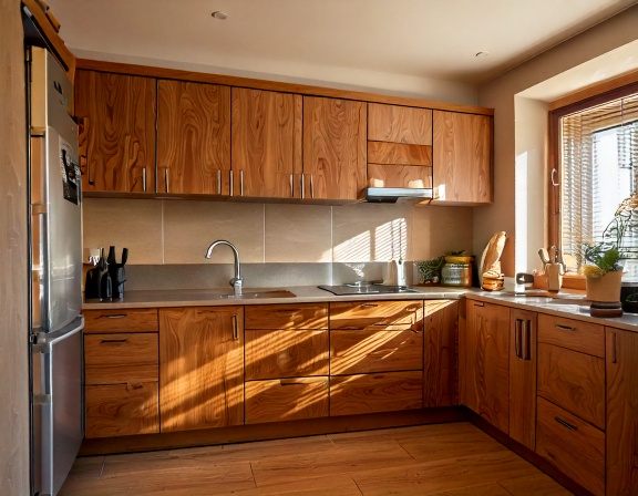 Bên cạnh đó, tủ bếp gỗ tự nhiên vẫn được nhiều gia đình yêu thích nhờ vẻ đẹp sang trọng và độ bền cao. Các loại gỗ thường dùng có thể kể đến như gỗ sồi, gỗ óc chó, gỗ xoan đào. Tuy nhiên, chi phí sẽ cao hơn và yêu cầu kỹ thuật xử lý gỗ nghiêm ngặt để hạn chế co ngót.