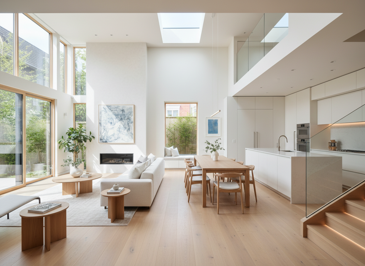 Dù diện tích hạn chế nhưng nhà phố vẫn có thể trở nên rộng rãi, sang trọng nếu biết ứng dụng đúng các nguyên tắc thiết kế. Bí quyết đầu tiên là tối ưu ánh sáng tự nhiên. Việc sử dụng cửa kính lớn, giếng trời, ô thông gió sẽ giúp không gian nhận nhiều ánh sáng hơn, khiến phòng trở nên thoáng đáng và tràn đầy năng lượng.