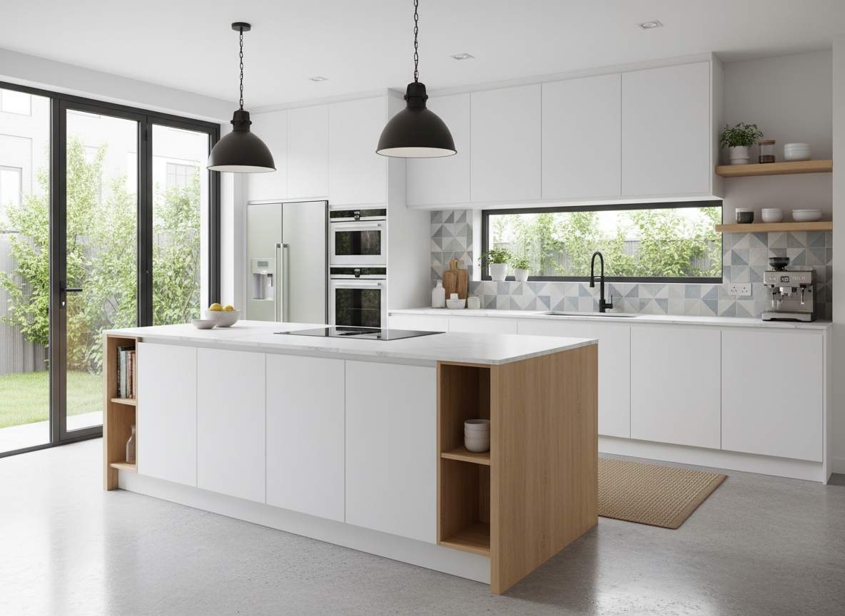 Phòng bếp là linh hồn của ngôi nhà, nơi giữ lửa hạnh phúc của gia đình. Các mẫu nội thất nhà phố đẹp cho khu vực bếp thường ưu tiên thiết kế chữ L hoặc chữ I nhằm tận dụng tối đa diện tích. Hệ tủ bếp trên – dưới được bố trí khoa học, vật liệu như MDF chống ẩm phủ melamine hoặc acrylic bóng gương giúp không gian thêm hiện đại, dễ vệ sinh và chống bám bụi.