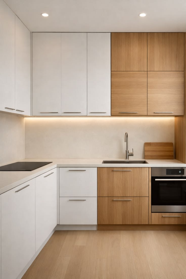 Đối với khu vực bếp, nên ưu tiên sử dụng plywood phủ laminate hoặc acrylic vì khả năng chống nước cao, chịu lực tốt và dễ vệ sinh. Phần thùng tủ nên chọn vật liệu chống ẩm lõi xanh, còn bề mặt nên dùng vật liệu phủ cao cấp để tăng độ bền và thẩm mỹ.