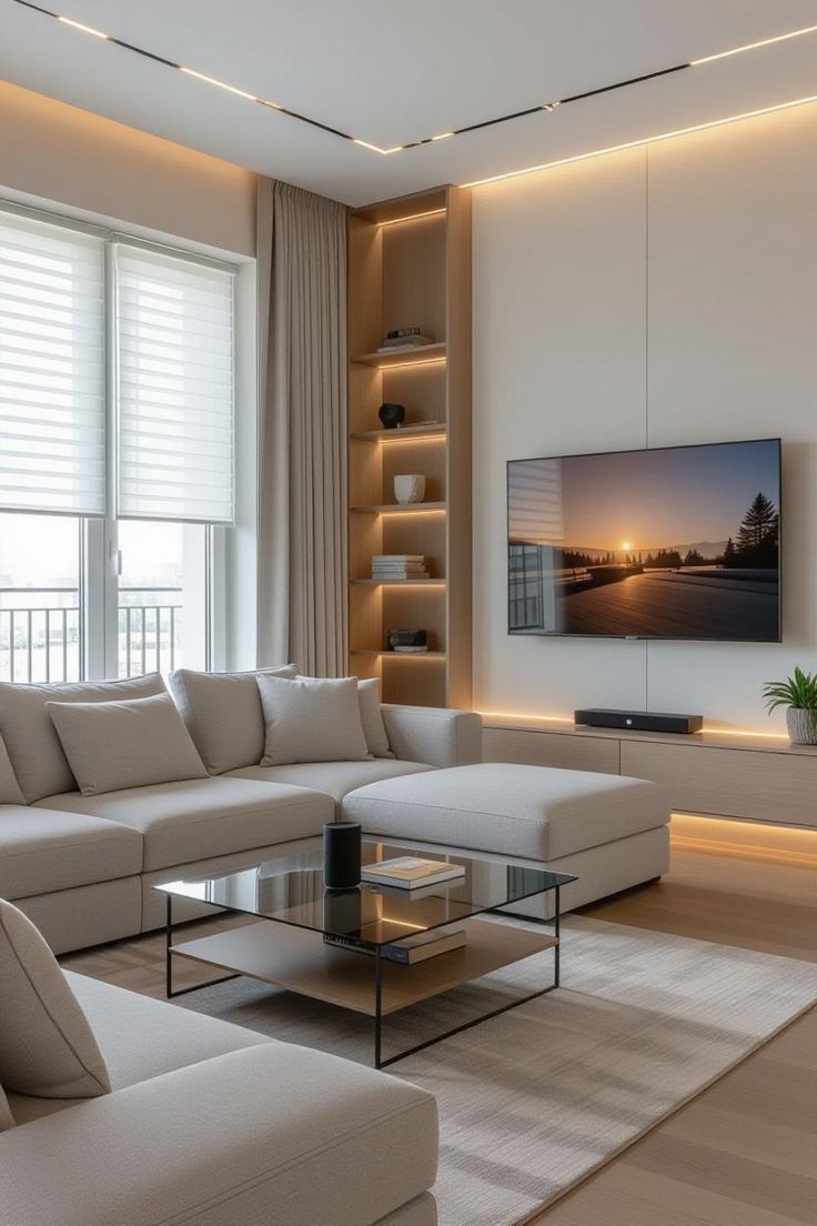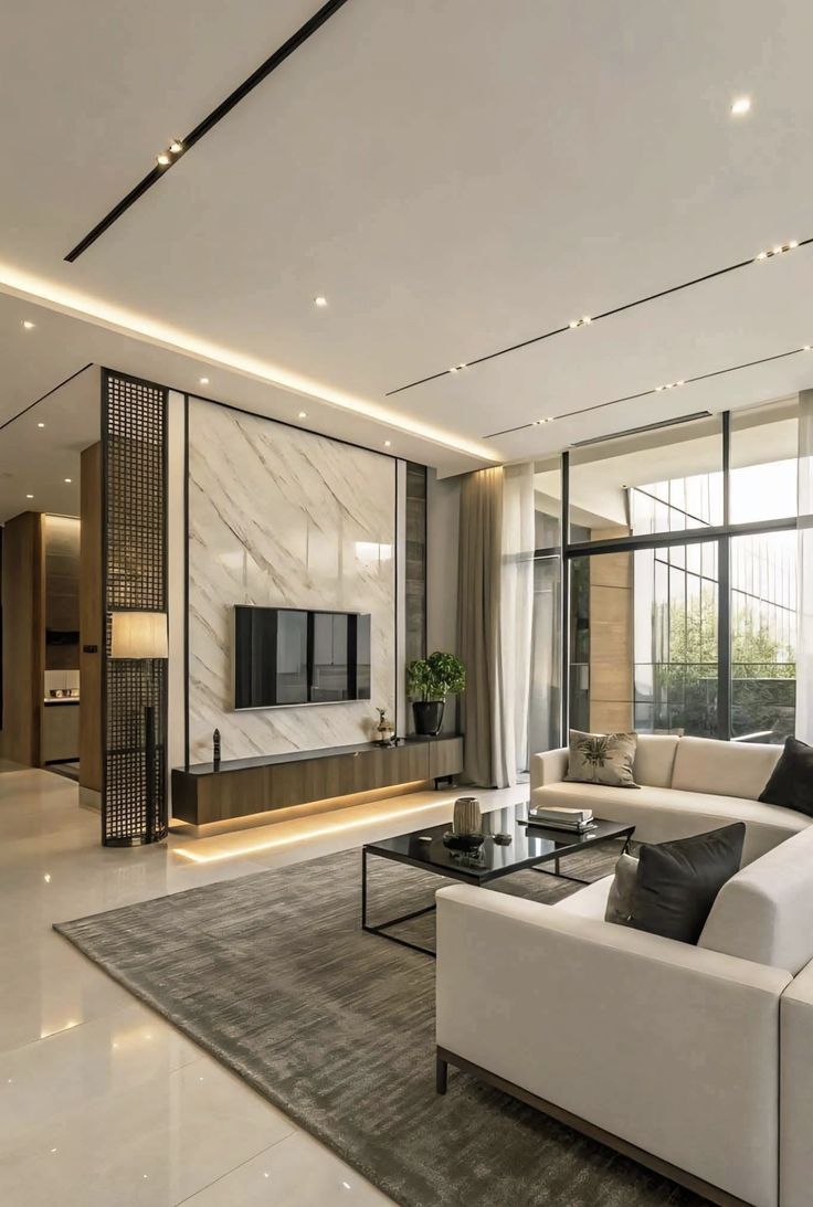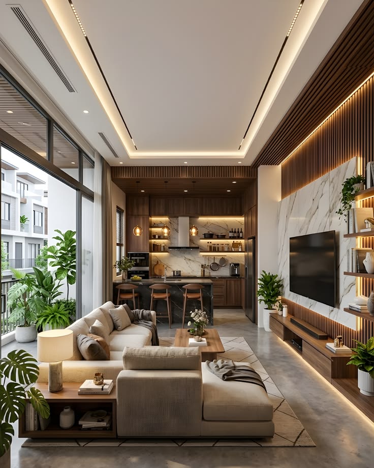Ngoài ra, ánh sáng cũng đóng vai trò quan trọng. Hệ thống đèn LED âm trần, đèn hắt khe, đèn trang trí được bố trí khoa học giúp tạo chiều sâu và cảm xúc cho không gian. Khi kết hợp với màu sắc trung tính như trắng, xám, be hoặc tone gỗ tự nhiên, tổng thể nội thất trở nên tinh tế và đẳng cấp hơn rất nhiều.