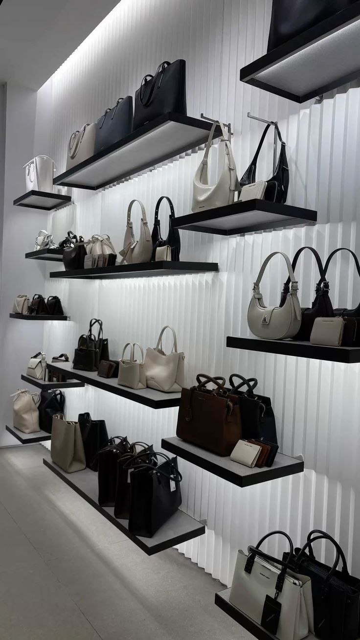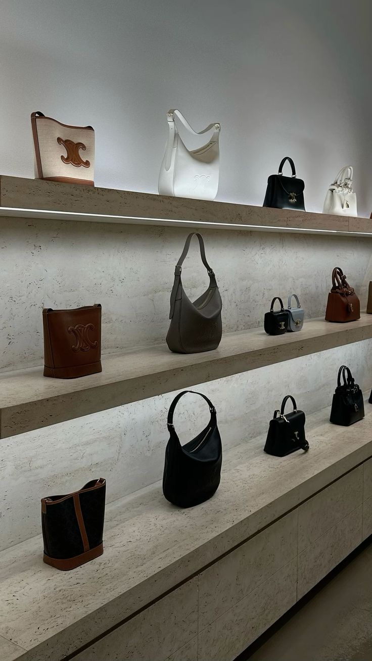 Khoảng cách giữa các kệ cũng cần được tính toán hợp lý để đảm bảo lối đi thông thoáng, tránh gây cảm giác bí bách. Ánh sáng đóng vai trò quan trọng trong việc làm nổi bật sản phẩm, do đó nên kết hợp hệ thống đèn chiếu điểm tại các khu vực trưng bày chính. Việc sắp xếp túi xách theo chiều cao, màu sắc hoặc phong cách cũng giúp tạo sự đồng bộ và thu hút ánh nhìn tự nhiên của khách hàng.