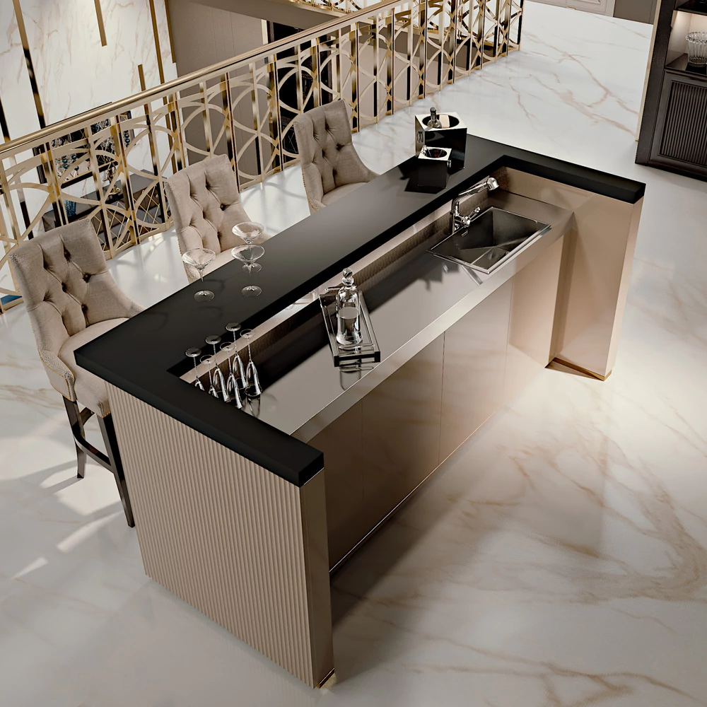 - Thiết kế tinh tế: Quầy Bar Pha Chế Cao Cấp được thiết kế với phong cách hiện đại, sử dụng những đường nét mượt mà cùng chất liệu cao cấp, tạo nên điểm nhấn sang trọng cho không gian.
