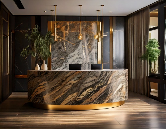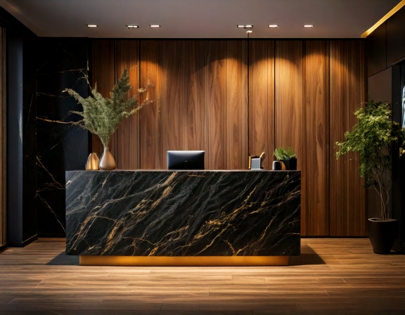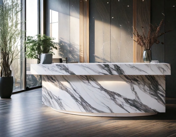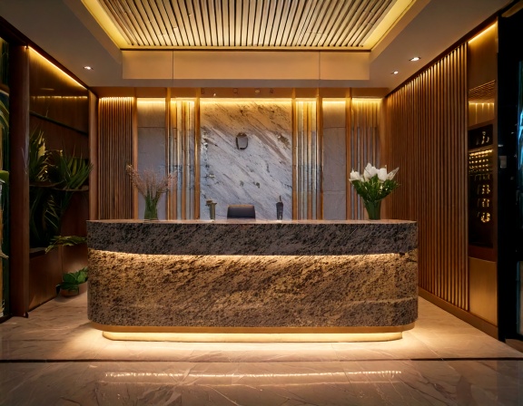 Hơn nữa, quầy lễ tân cao cấp mặt đá còn giúp tạo hiệu ứng thị giác mở rộng không gian nhờ các vân đá sáng bóng và ánh sáng phản chiếu. Đây là yếu tố tinh tế nhưng quan trọng, giúp sảnh lễ tân trở nên thoáng đãng, sang trọng, tạo ấn tượng tích cực ngay từ cái nhìn đầu tiên đối với khách hàng và đối tác.