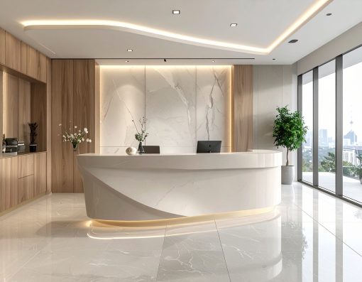 - Mặt đá nhân tạo hoặc đá tự nhiên: Thường dùng cho mặt bàn quầy lễ tân, vừa bền vừa tạo điểm nhấn thẩm mỹ, dễ vệ sinh và chịu được tác động từ môi trường.