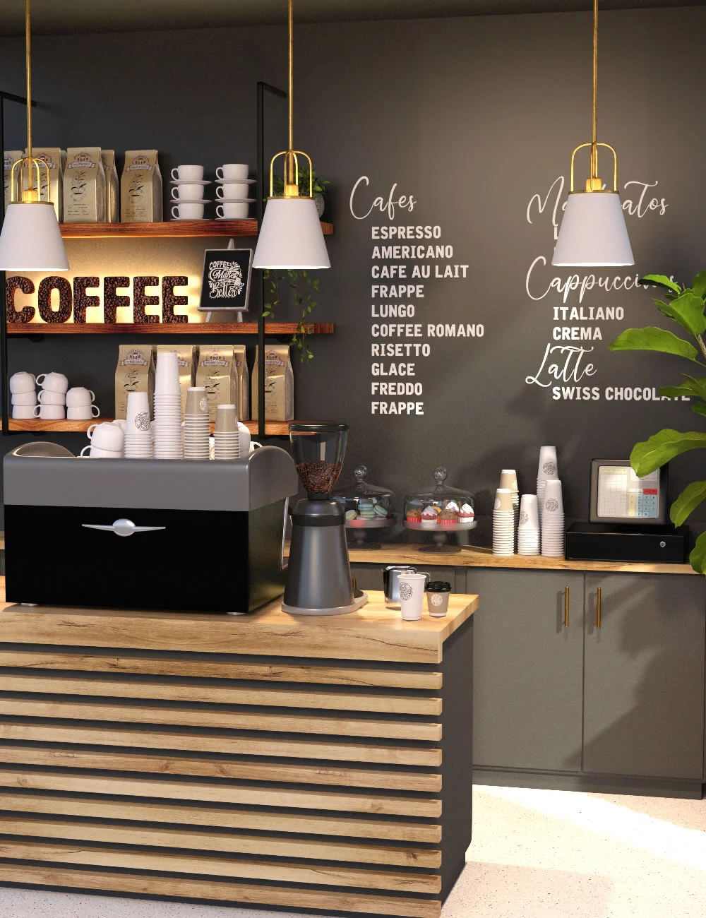 Mẫu quầy kích thước 1.5m, tích hợp máy pha cà phê, máy xay hạt, ngăn kéo đựng ly và hộp đựng đường. Thiết kế tối giản, màu nâu – đen sang trọng.