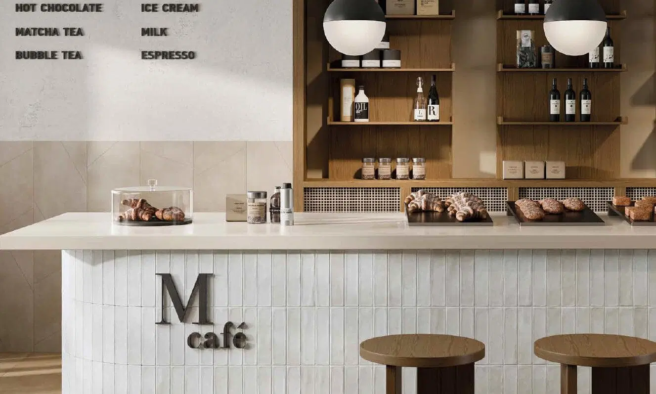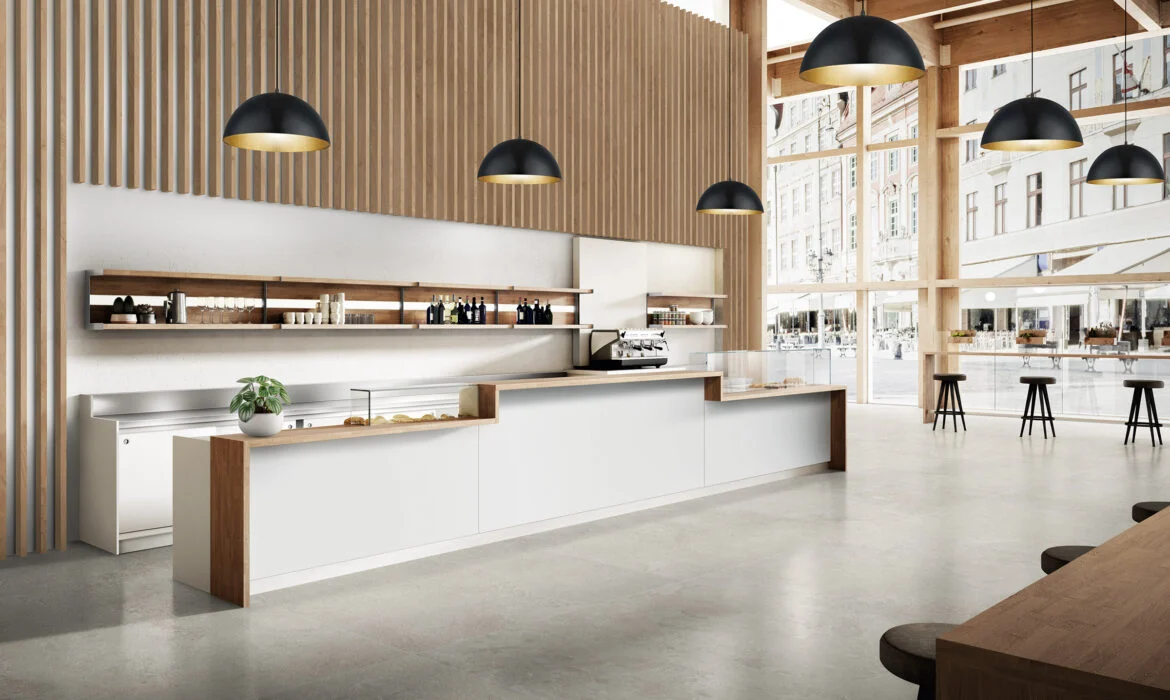 Quầy cafe gỗ công nghiệp kết hợp mặt đá – tạo cảm giác sang trọng, sạch sẽ và dễ lau chùi.