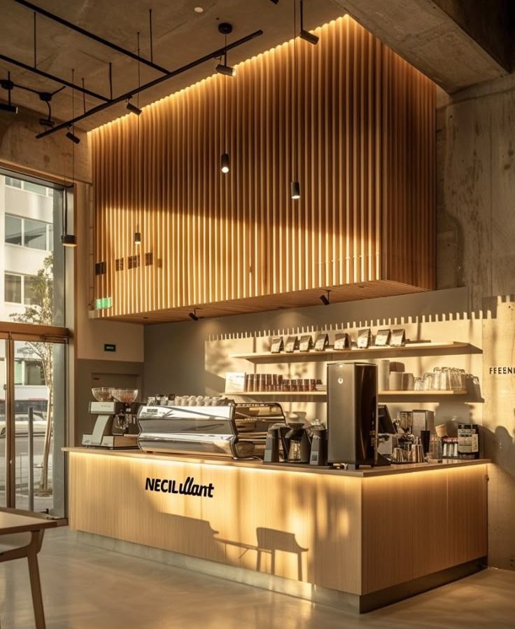 Trong thiết kế nội thất quán cafe hiện đại, gỗ melamine được đánh giá là một trong những vật liệu tối ưu nhất nhờ sự cân bằng giữa chi phí – độ bền – tính thẩm mỹ. Bề mặt melamine có nhiều màu sắc như vân gỗ, trắng, đen, xám, màu xi măng hoặc các màu pastel nhẹ nhàng, giúp quầy pha chế dễ dàng kết hợp với nhiều phong cách thiết kế khác nhau.