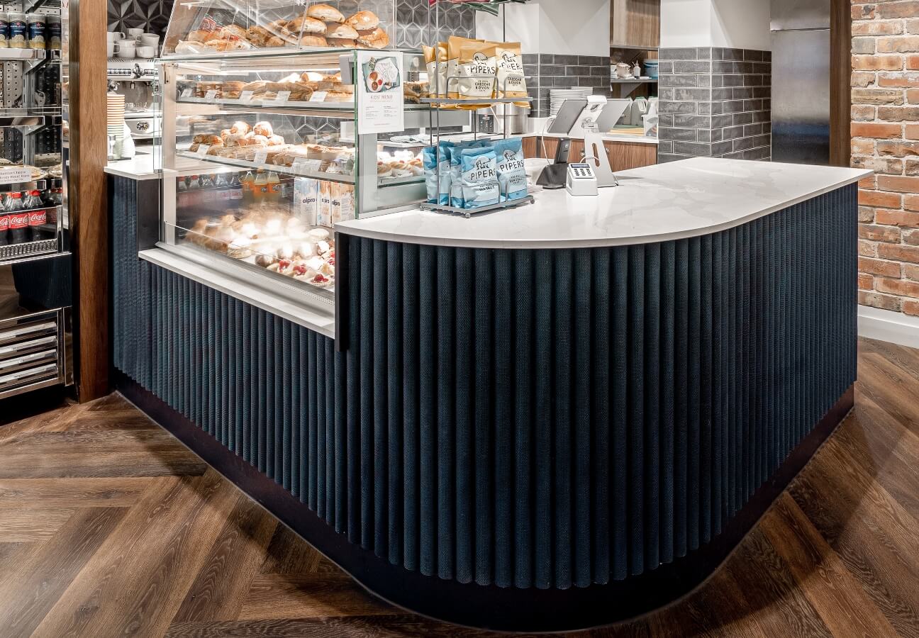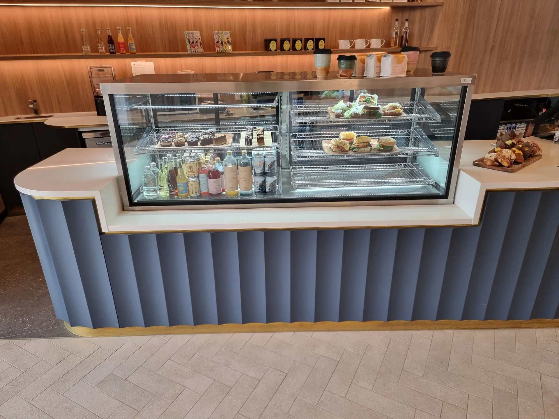 Quầy pha chế kết hợp trưng bày là loại quầy được thiết kế tích hợp cả khu vực pha chế đồ uống và không gian để trưng bày sản phẩm như bánh, bánh mì, nước đóng chai, hạt cafe, túi giấy, cốc sứ, phụ kiện decor hoặc các sản phẩm bán lẻ khác của quán.