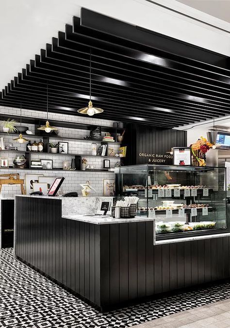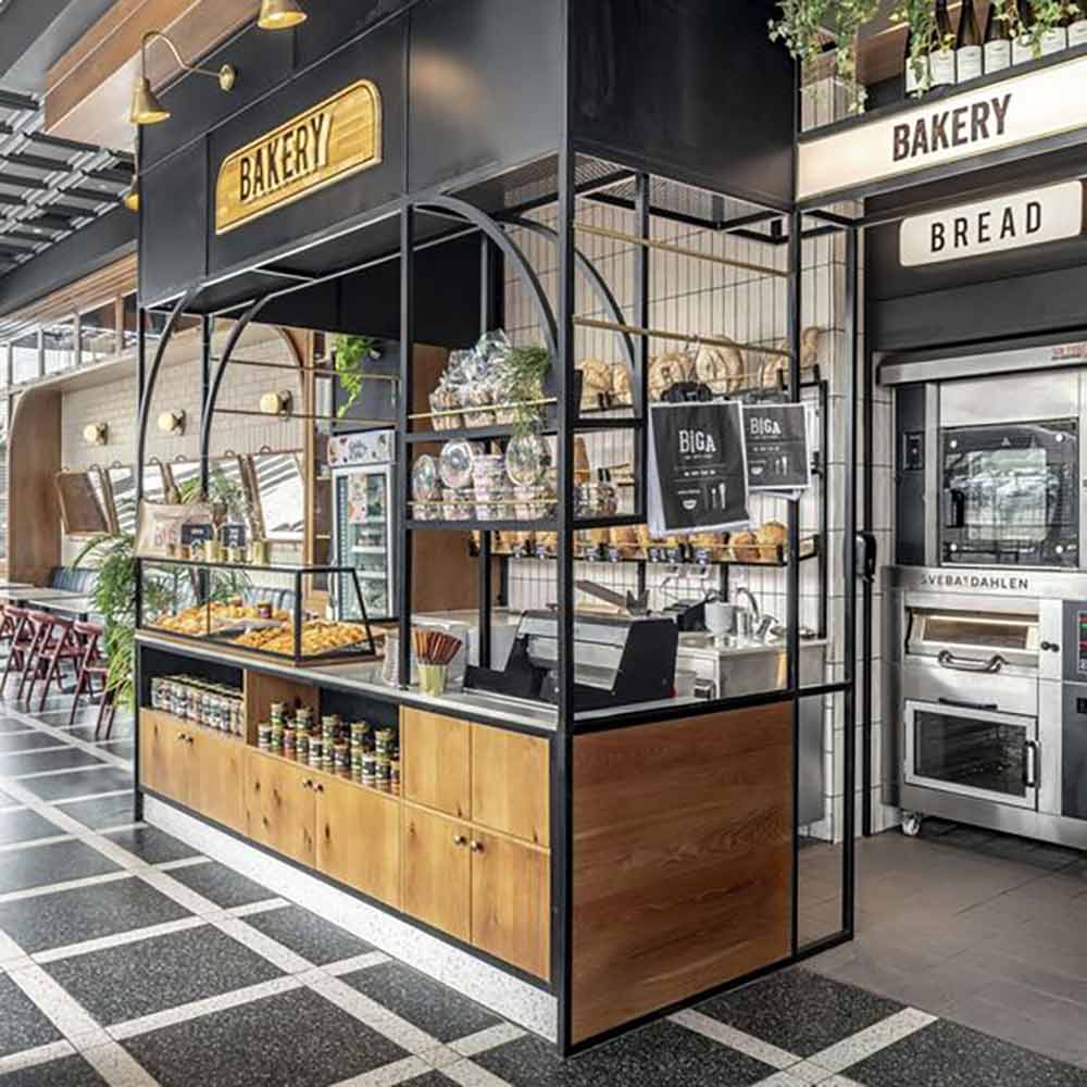 Phân tách rõ ràng khu pha chế và khu trưng bày bằng góc vuông. Kệ trưng bày có thể dựng tầng hoặc kính trong suốt để tạo hiệu ứng mở.