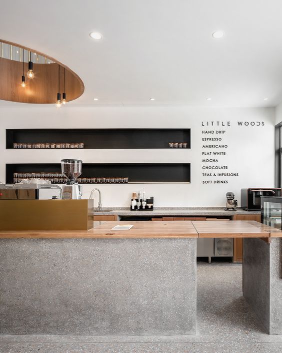 Bên cạnh đó, quầy pha chế kết hợp trưng bày cũng đang trở thành xu hướng phổ biến. Phần kệ phía sau quầy được thiết kế để trưng bày ly, cà phê hoặc các vật trang trí, tạo điểm nhấn cho không gian quán.