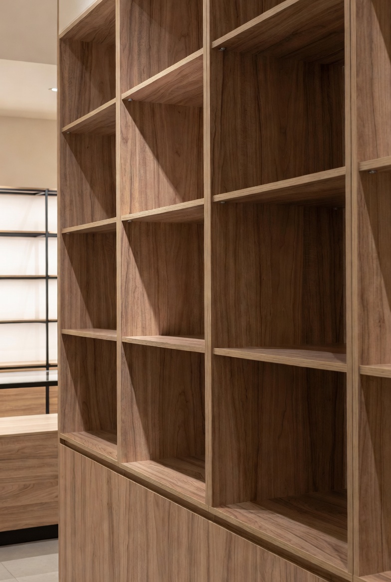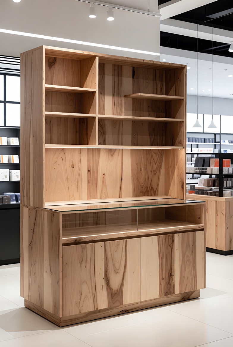 Tiếp theo là lựa chọn chất liệu phù hợp. Nếu cửa hàng cần sự sang trọng, tủ kính kết hợp gỗ sẽ là lựa chọn lý tưởng. Đối với những cửa hàng cần độ bền cao và chi phí hợp lý, tủ gỗ công nghiệp phủ melamine là giải pháp phổ biến.