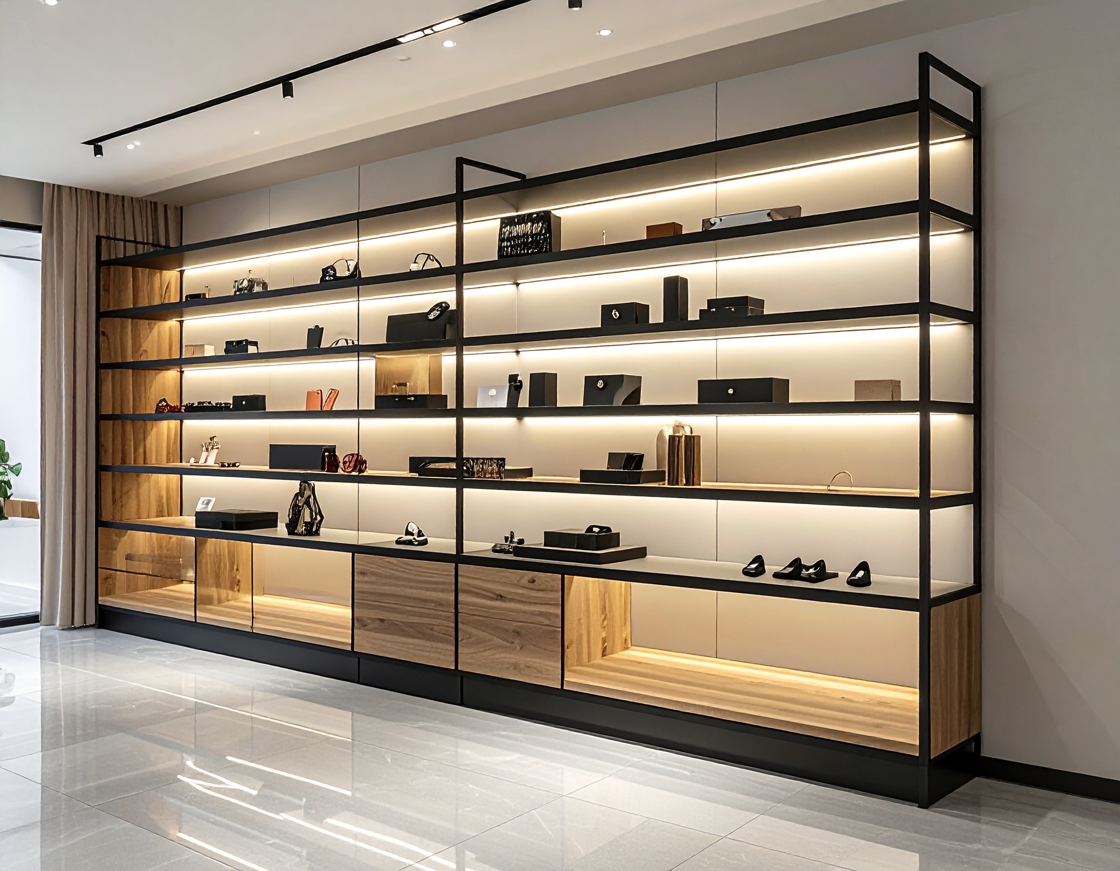 Ngoài ra, tủ trưng bày kết hợp kệ mở cũng đang trở thành xu hướng trong thiết kế shop hiện đại. Kiểu tủ này giúp cửa hàng trưng bày được nhiều sản phẩm hơn, đồng thời tạo cảm giác không gian mở và thoáng đãng.