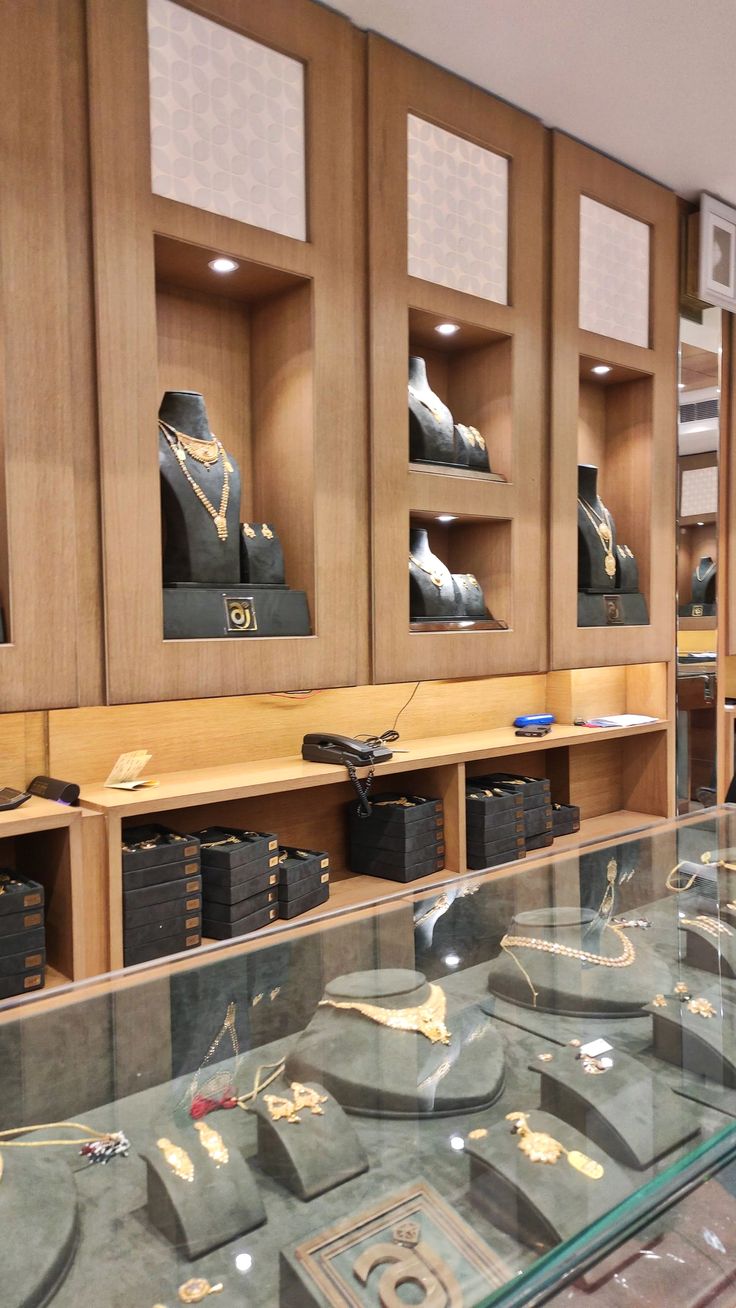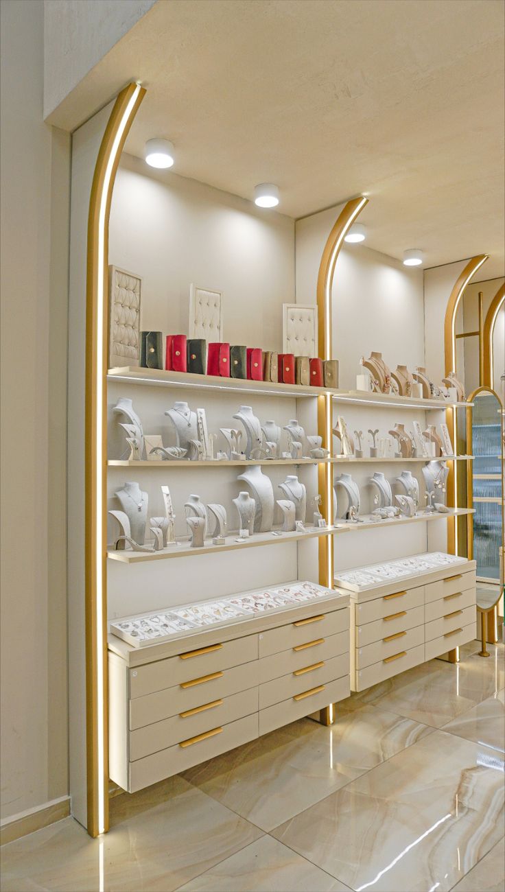 Bên cạnh đó, nhiều cửa hàng trang sức cao cấp còn sử dụng tủ trưng bày kết hợp kệ trang trí nhằm tạo điểm nhấn cho không gian. Những mẫu tủ này thường được thiết kế sang trọng và đồng bộ với phong cách nội thất của cửa hàng.