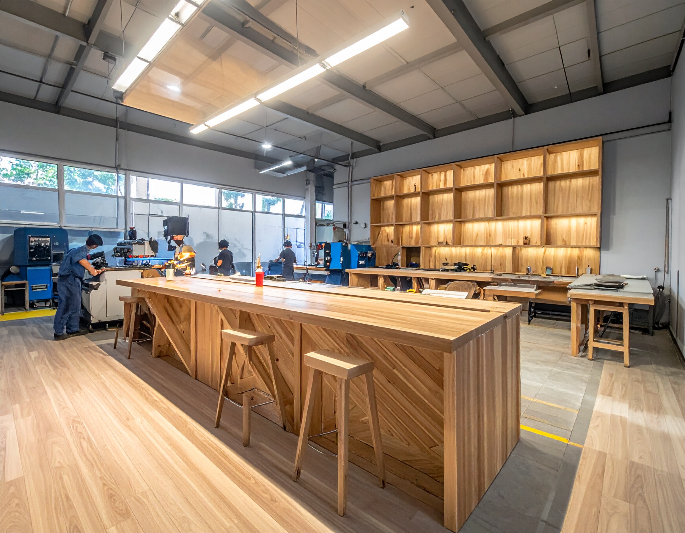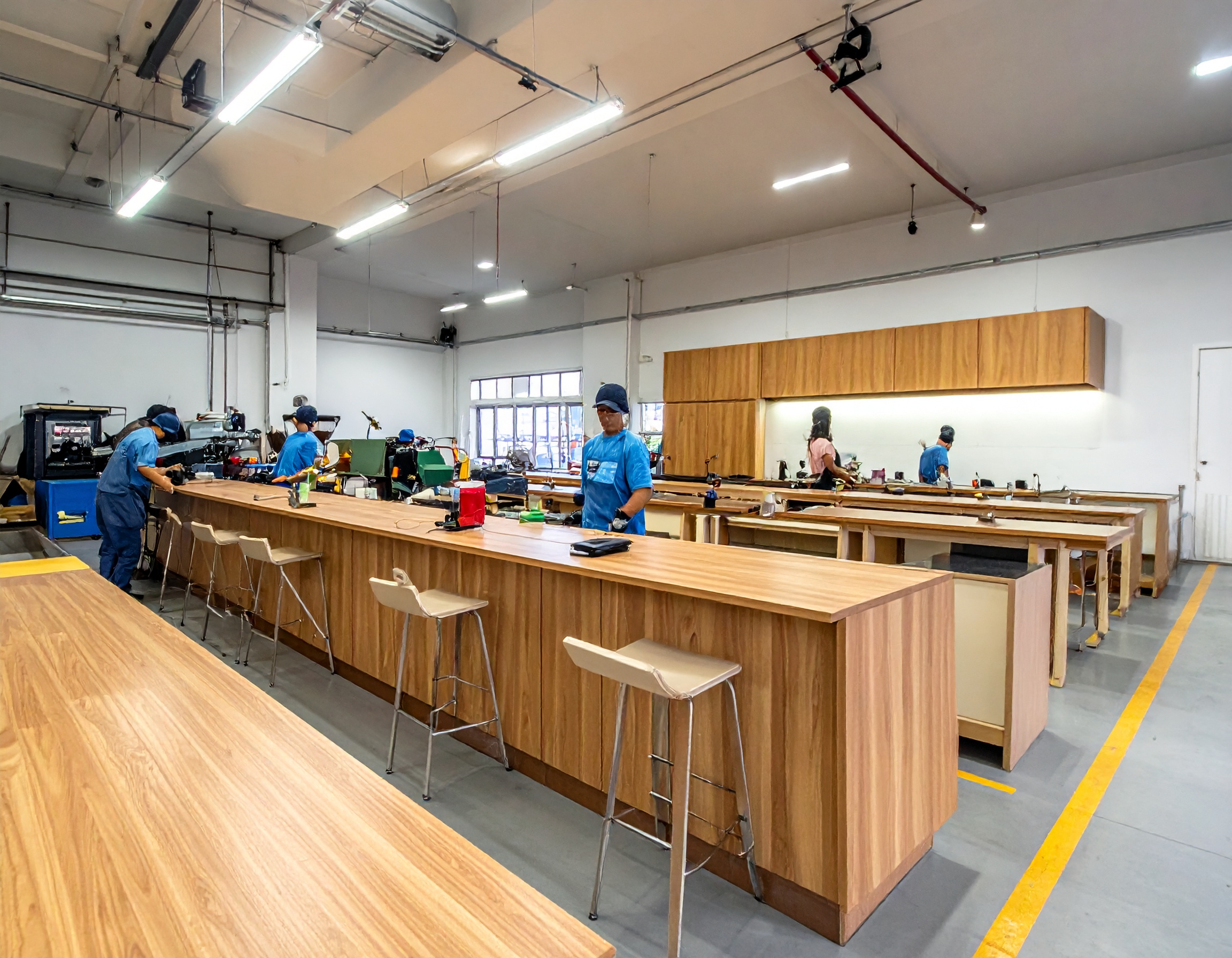 Ưu điểm của BLUECONS nằm ở xưởng sản xuất trực tiếp, giúp kiểm soát chất lượng sản phẩm từ khâu chọn vật liệu đến hoàn thiện. Nhờ đó, mỗi quầy pha chế đều đạt tiêu chuẩn về độ bền, thẩm mỹ và công năng sử dụng.