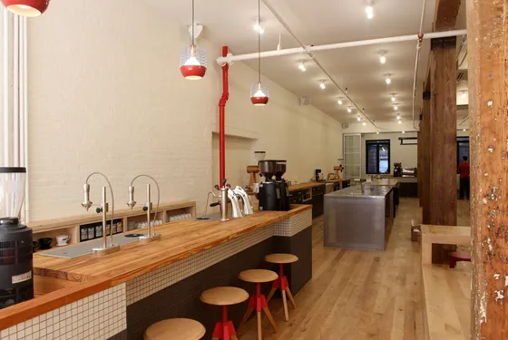 Một bên phục vụ thao tác đồ uống, bên còn lại là nơi thu ngân.