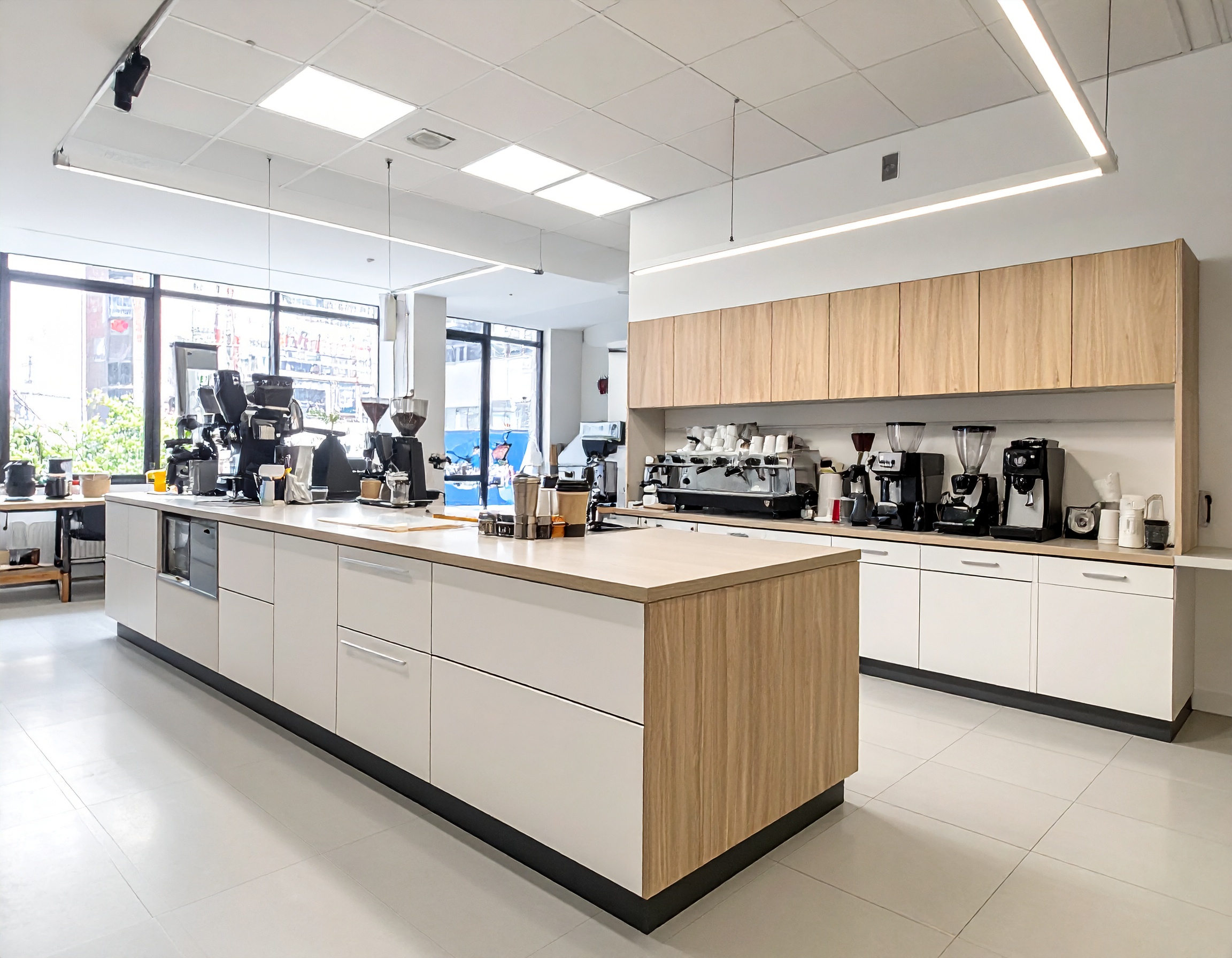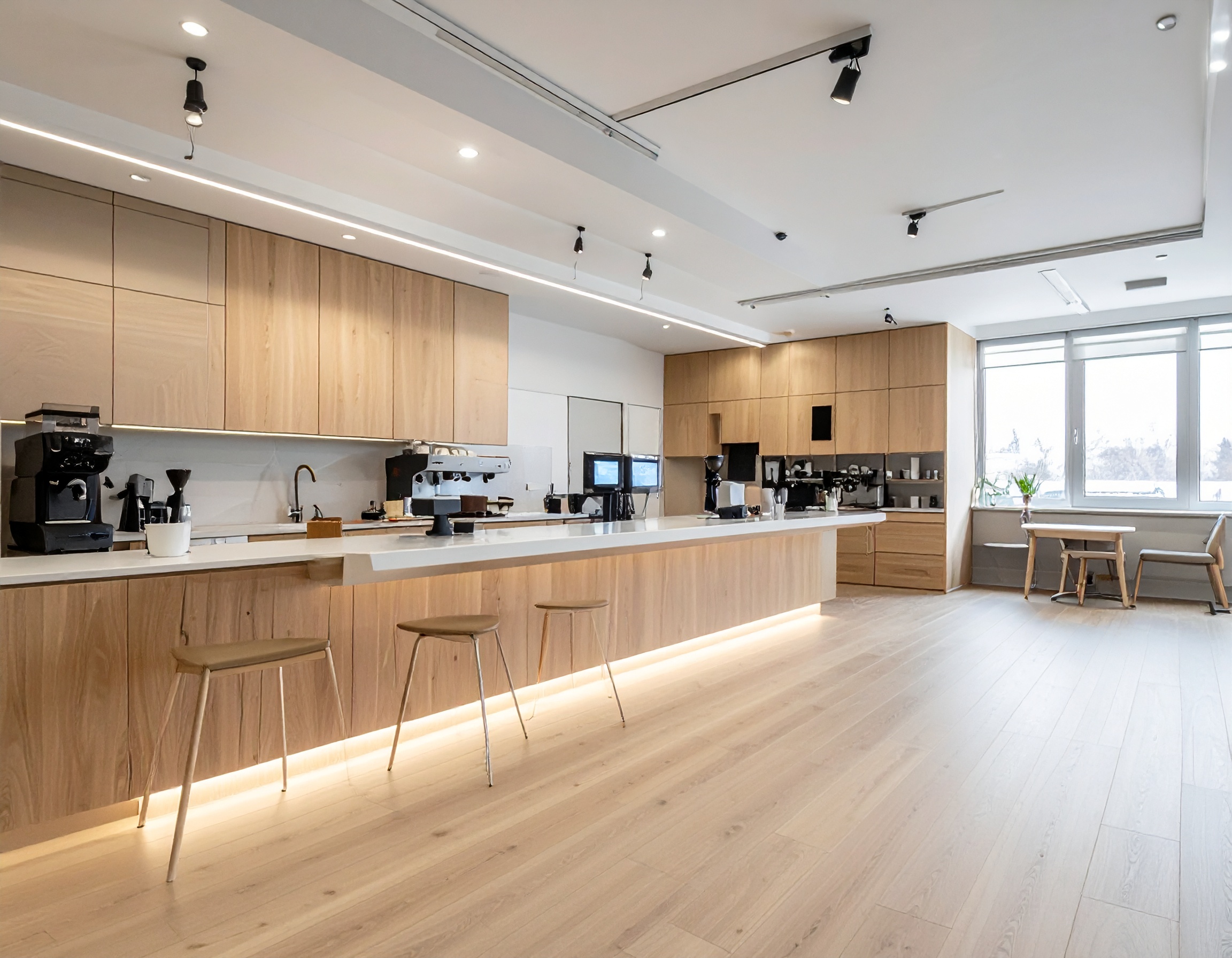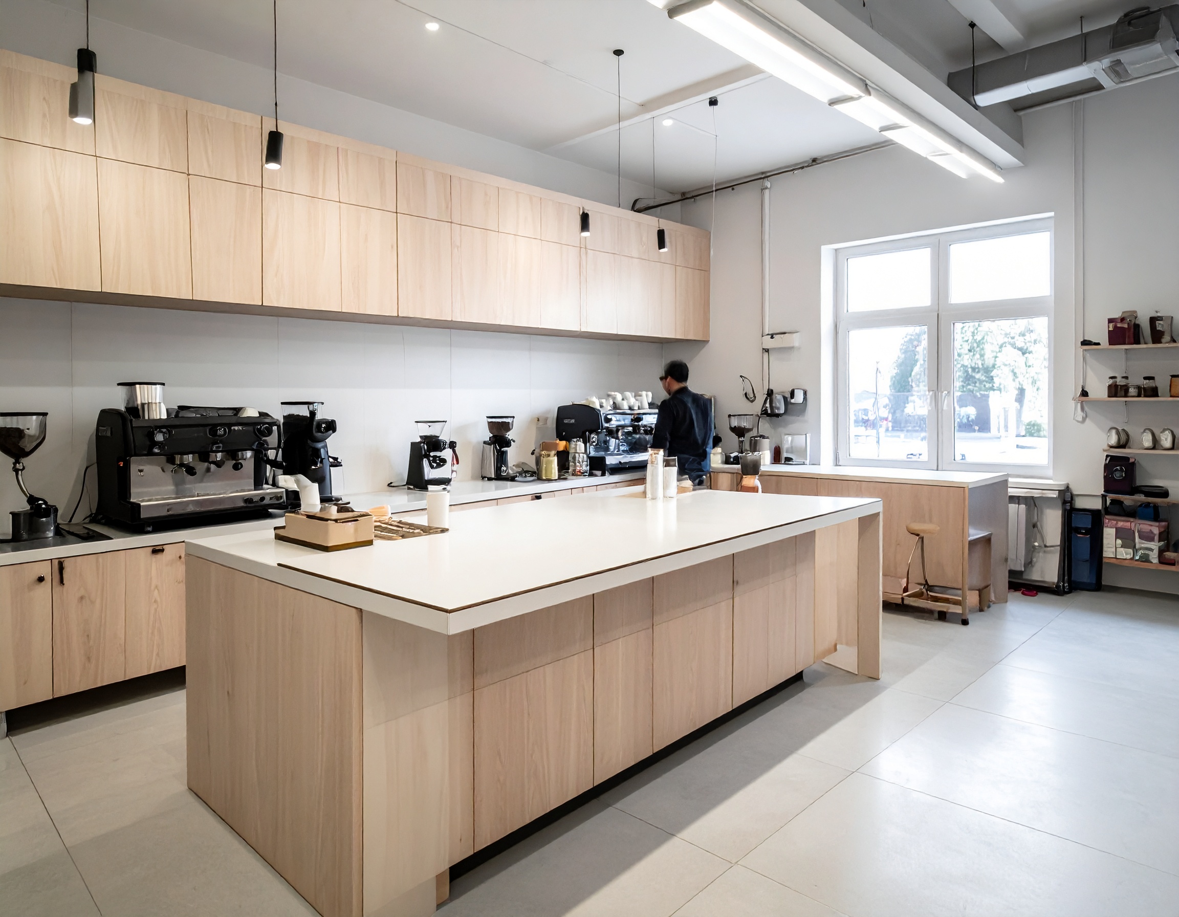 Đối với quán cafe, quầy pha chế thường được thiết kế rộng rãi để đặt các thiết bị như máy pha cafe, máy xay hạt, tủ lạnh và khu chuẩn bị nguyên liệu. Đây cũng là khu vực thường được bố trí ở vị trí trung tâm để tạo điểm nhấn cho không gian quán.