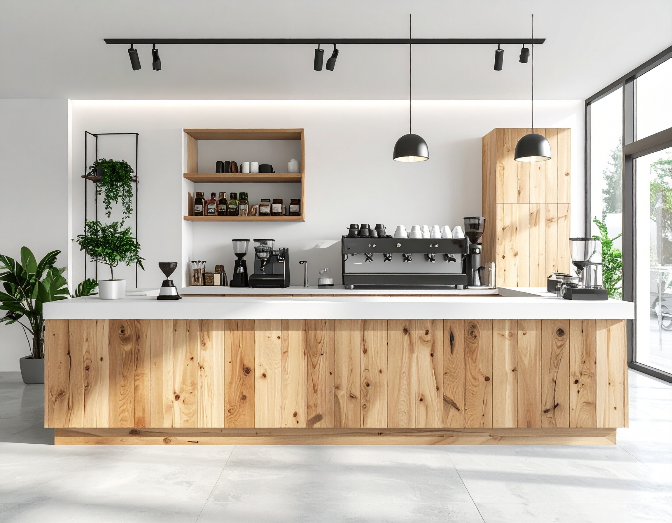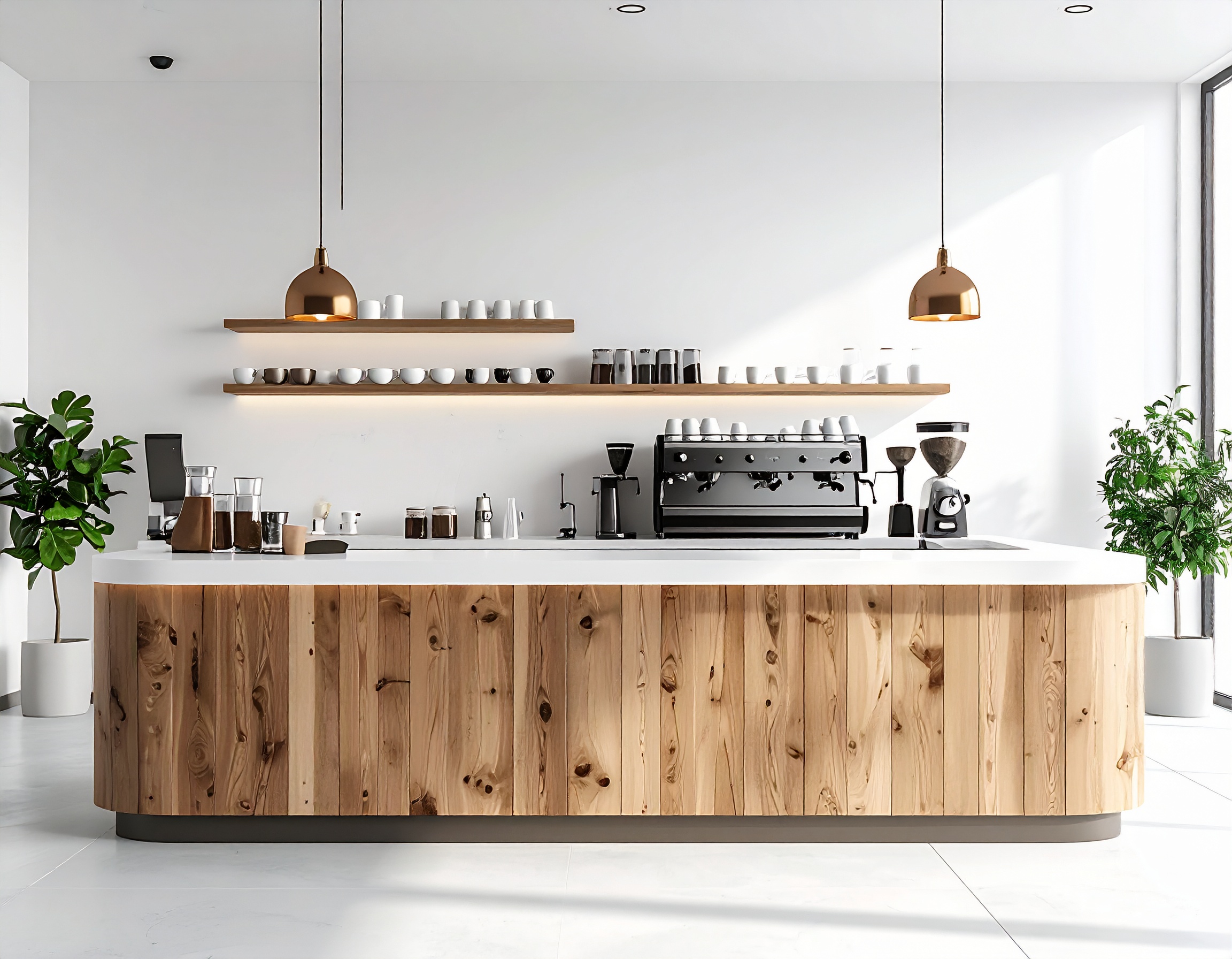 Về vật liệu, quầy pha chế cafe gỗ công nghiệp phủ melamine, laminate hoặc veneer đang được ưa chuộng nhờ tính thẩm mỹ cao, màu sắc đa dạng và chi phí hợp lý. Với các quán theo phong cách cao cấp, quầy pha chế kết hợp gỗ tự nhiên, đá và kim loại tạo nên sự sang trọng và khác biệt rõ rệt.