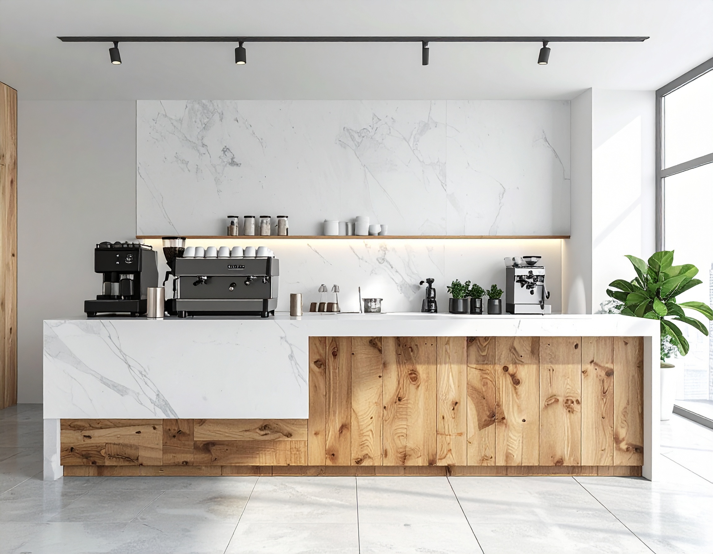 Mặt quầy pha chế cafe chuyên dụng thường sử dụng đá granite, đá nhân tạo hoặc inox 304 để đảm bảo khả năng chống nước, chịu nhiệt, dễ vệ sinh và bền bỉ theo thời gian. Đây là khu vực tiếp xúc trực tiếp với nước, cà phê, sữa và hóa chất vệ sinh nên yêu cầu vật liệu có độ bền cao, không thấm nước, không bong tróc.
