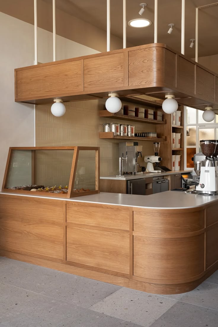 Mẫu quầy pha chế cafe gỗ đẹp bo cong mềm mại đang là xu hướng nổi bật năm 2026. Những đường cong nhẹ ở mặt trước quầy giúp không gian trở nên tinh tế, cao cấp và tạo điểm nhấn khác biệt. Thiết kế này thường được kết hợp với hệ đèn LED âm hoặc logo thương hiệu nổi bật phía trước.