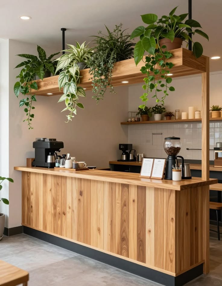 Một xu hướng nổi bật là thiết kế quầy mở, cho phép khách hàng quan sát trực tiếp quá trình pha chế. Điều này tạo sự minh bạch và tăng tính tương tác giữa barista và khách hàng. Bên cạnh đó, ánh sáng LED âm tủ, hệ thống kệ treo tối giản và các mảng ốp gỗ tự nhiên đang được ưa chuộng nhằm mang lại cảm giác ấm áp nhưng vẫn giữ được sự tinh tế.