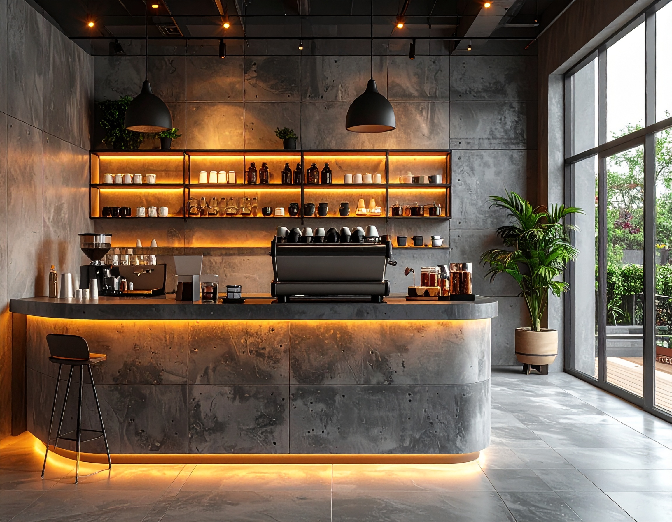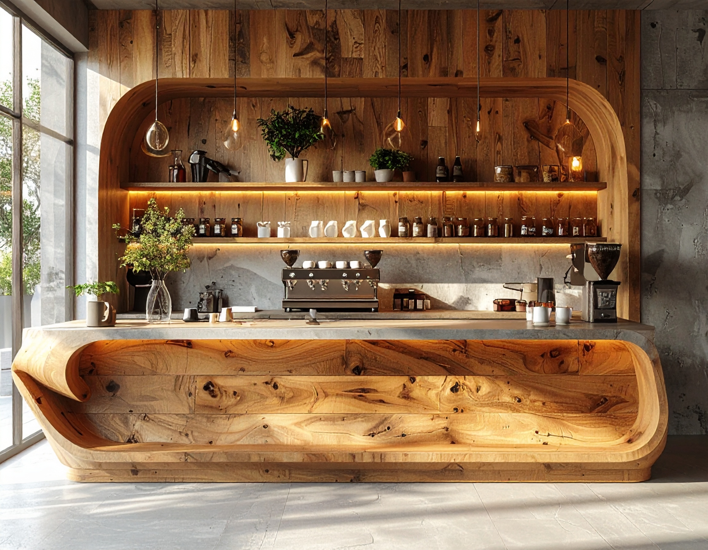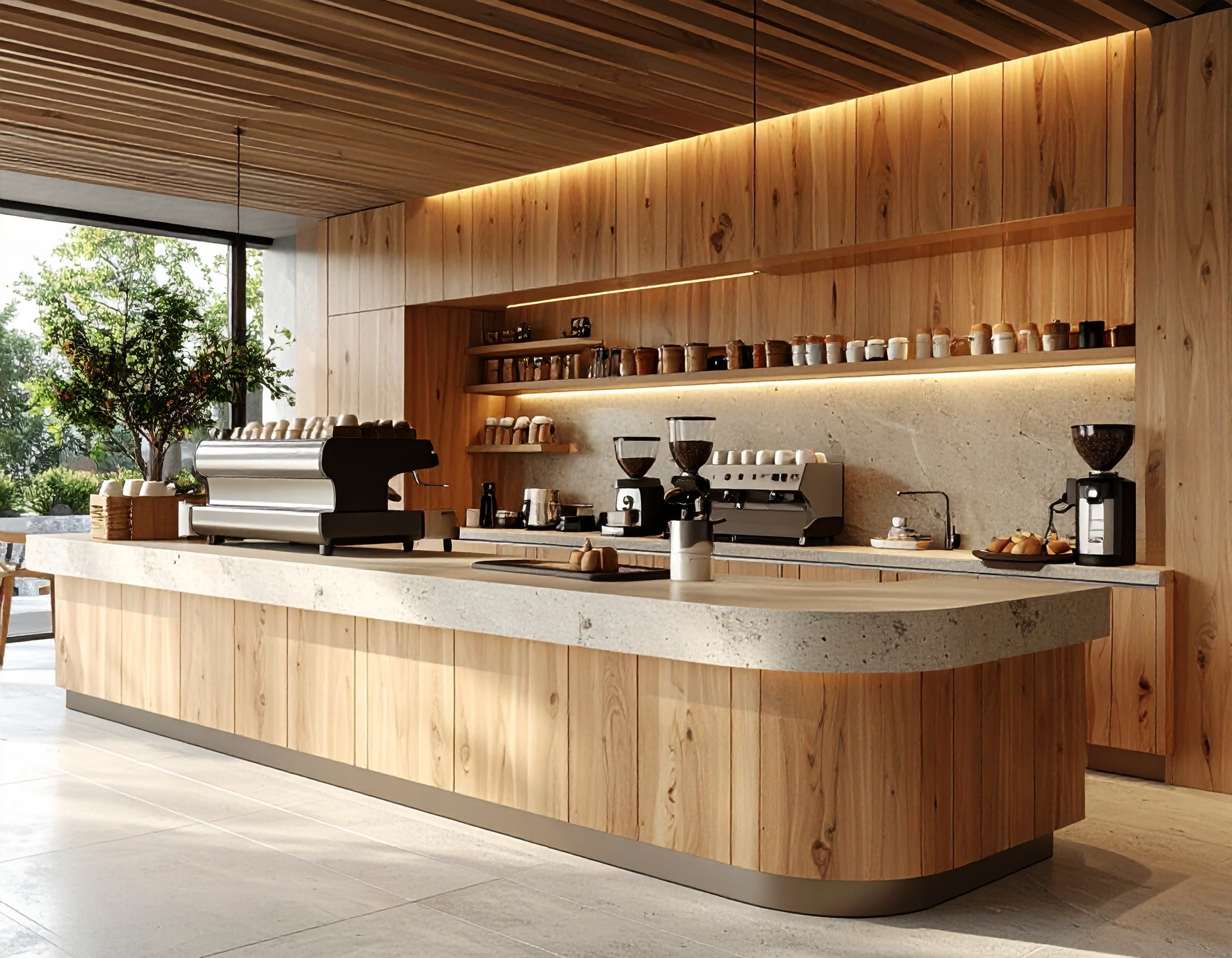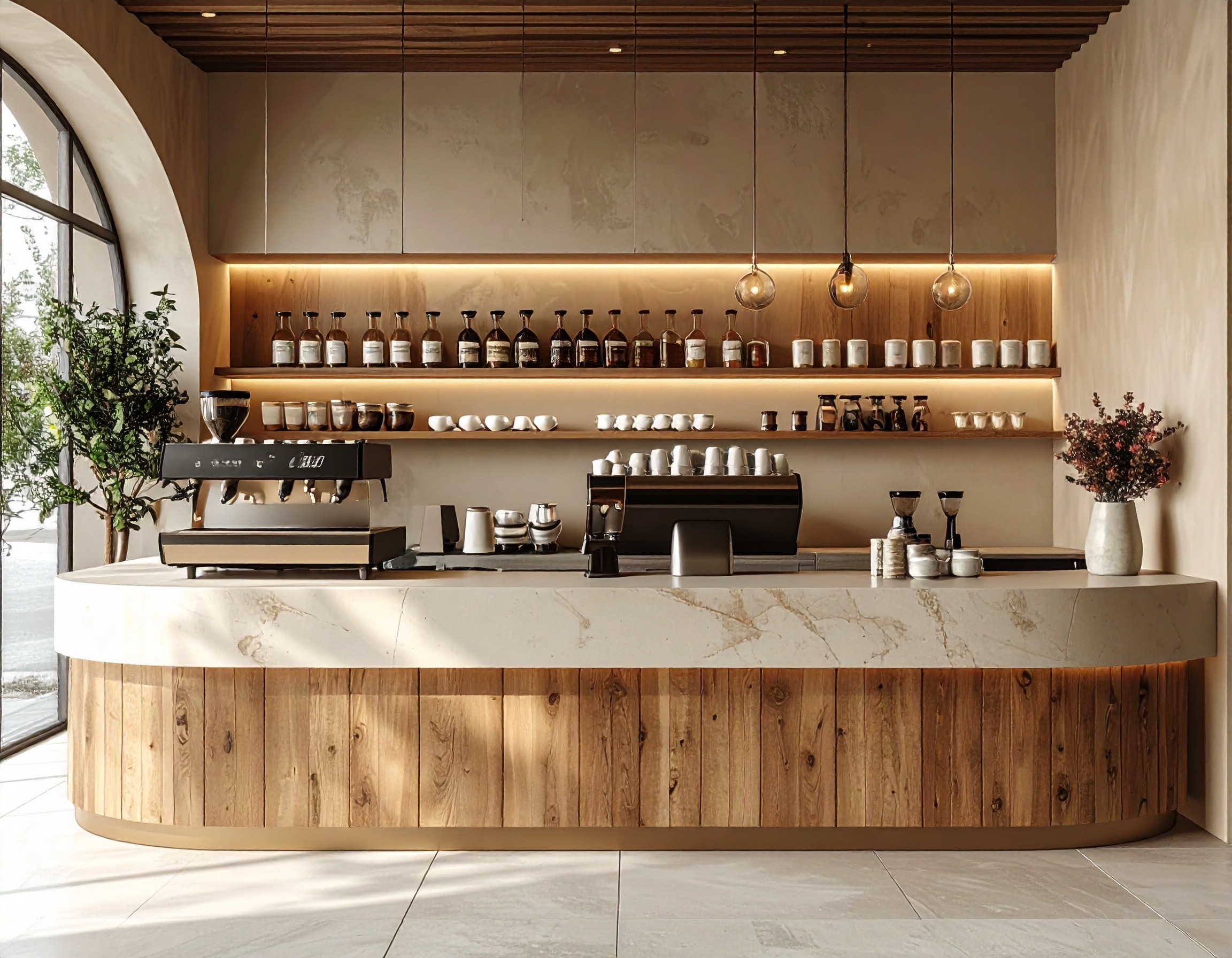 Ngoài ra, nhiều quán cafe hiện nay ưu tiên quầy pha chế chữ L, chữ U hoặc quầy bo cong, giúp tối ưu luồng di chuyển và tạo sự mềm mại cho không gian. Những thiết kế này không chỉ đẹp mắt mà còn rất hiệu quả trong vận hành thực tế.