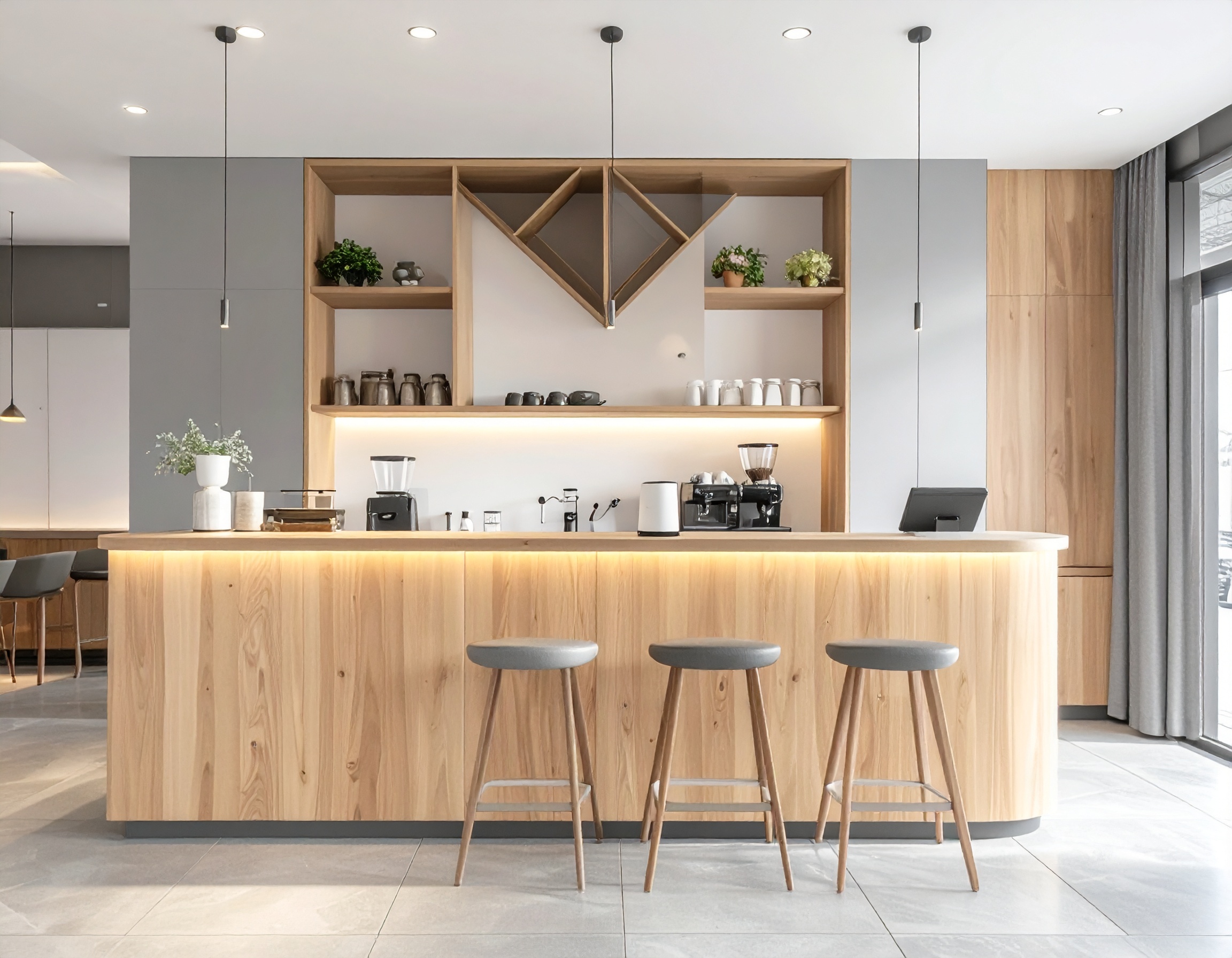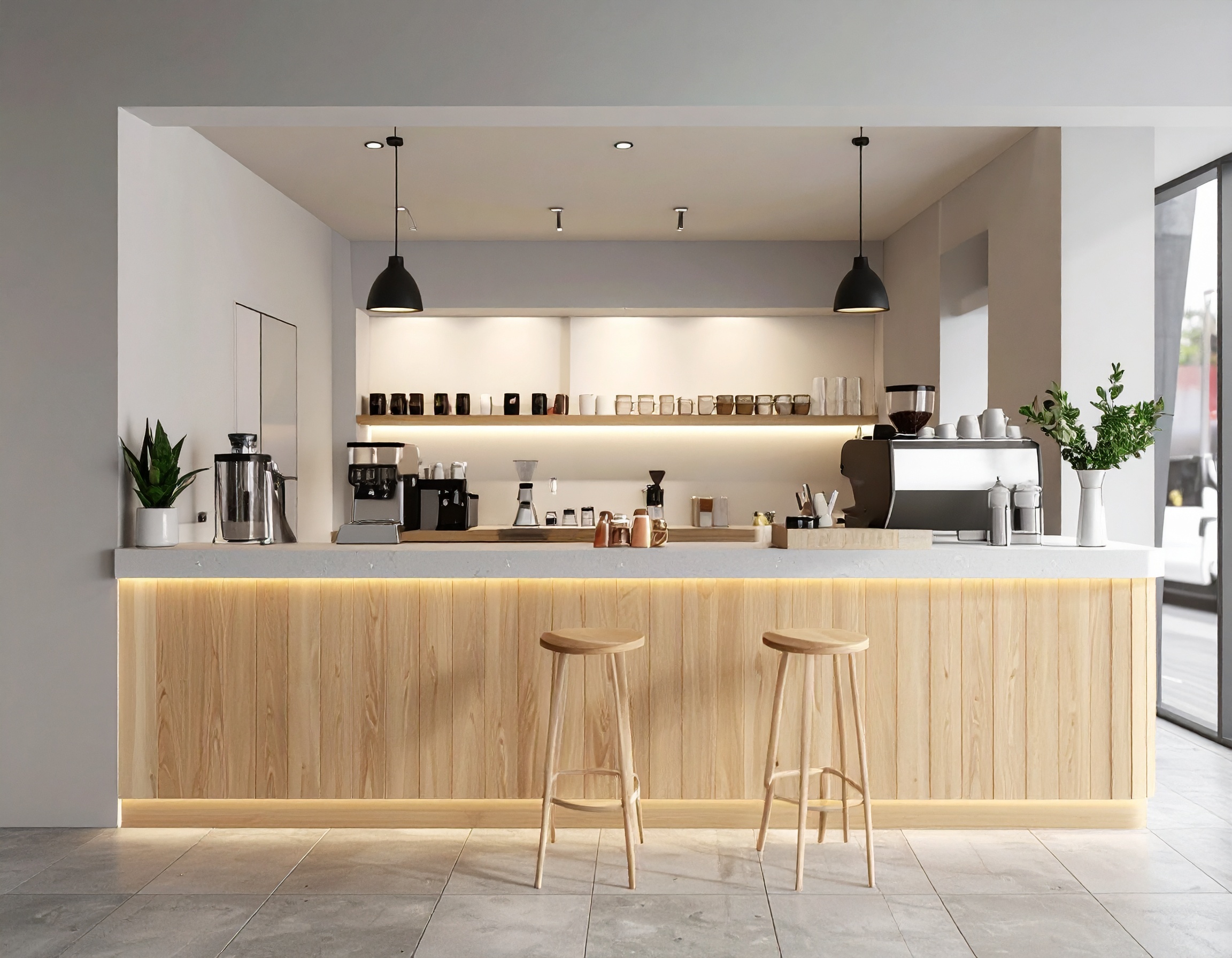Yếu tố thứ ba là kết cấu và kỹ thuật thi công. Quầy cần có khung xương chắc chắn, liên kết kỹ, hạn chế tối đa rung lắc khi sử dụng máy pha công suất lớn. Các chi tiết bo cạnh, nẹp, mối ghép phải hoàn thiện gọn gàng, đảm bảo an toàn và tính thẩm mỹ.