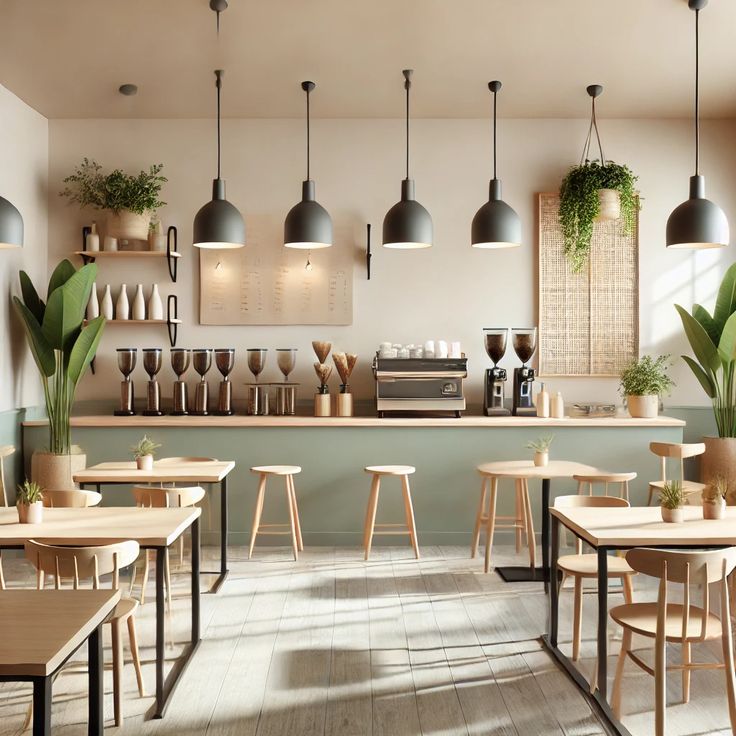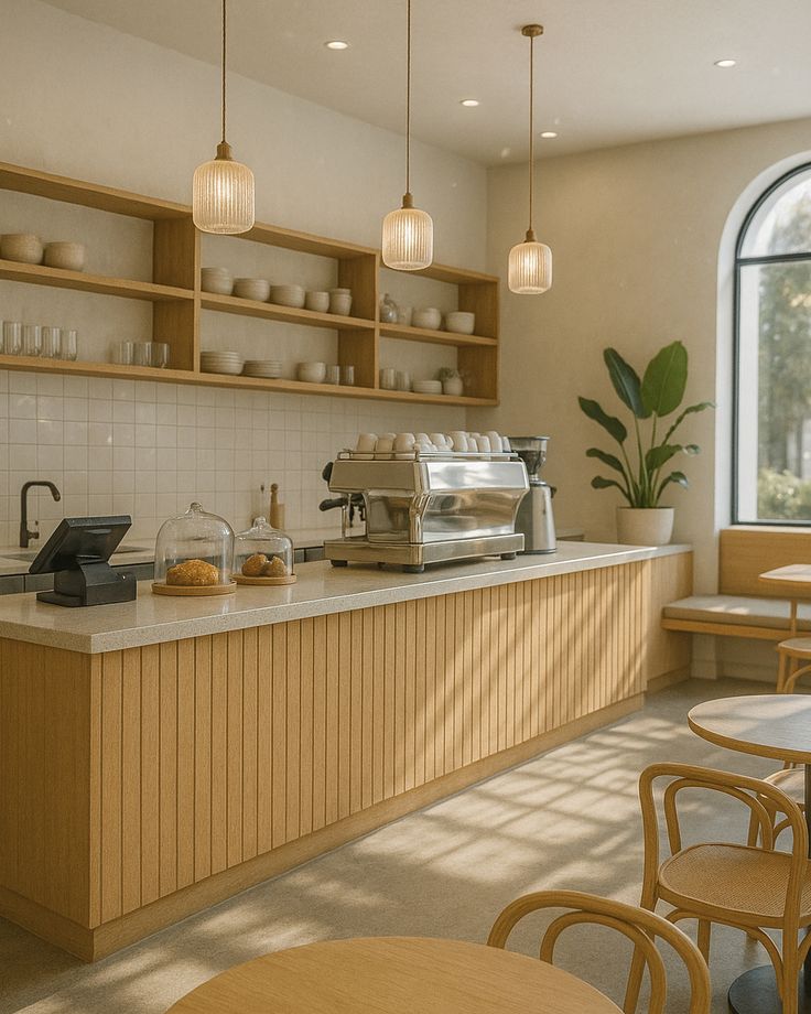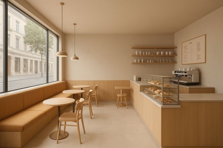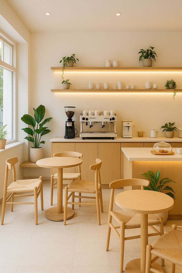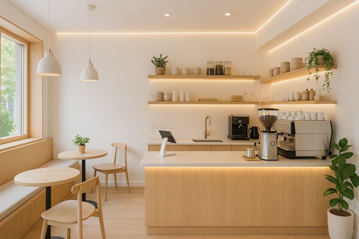 Thiết kế tối giản, màu trung tính như trắng, xám, vân gỗ sáng. Phù hợp quán cà phê cao cấp, không gian trẻ trung.