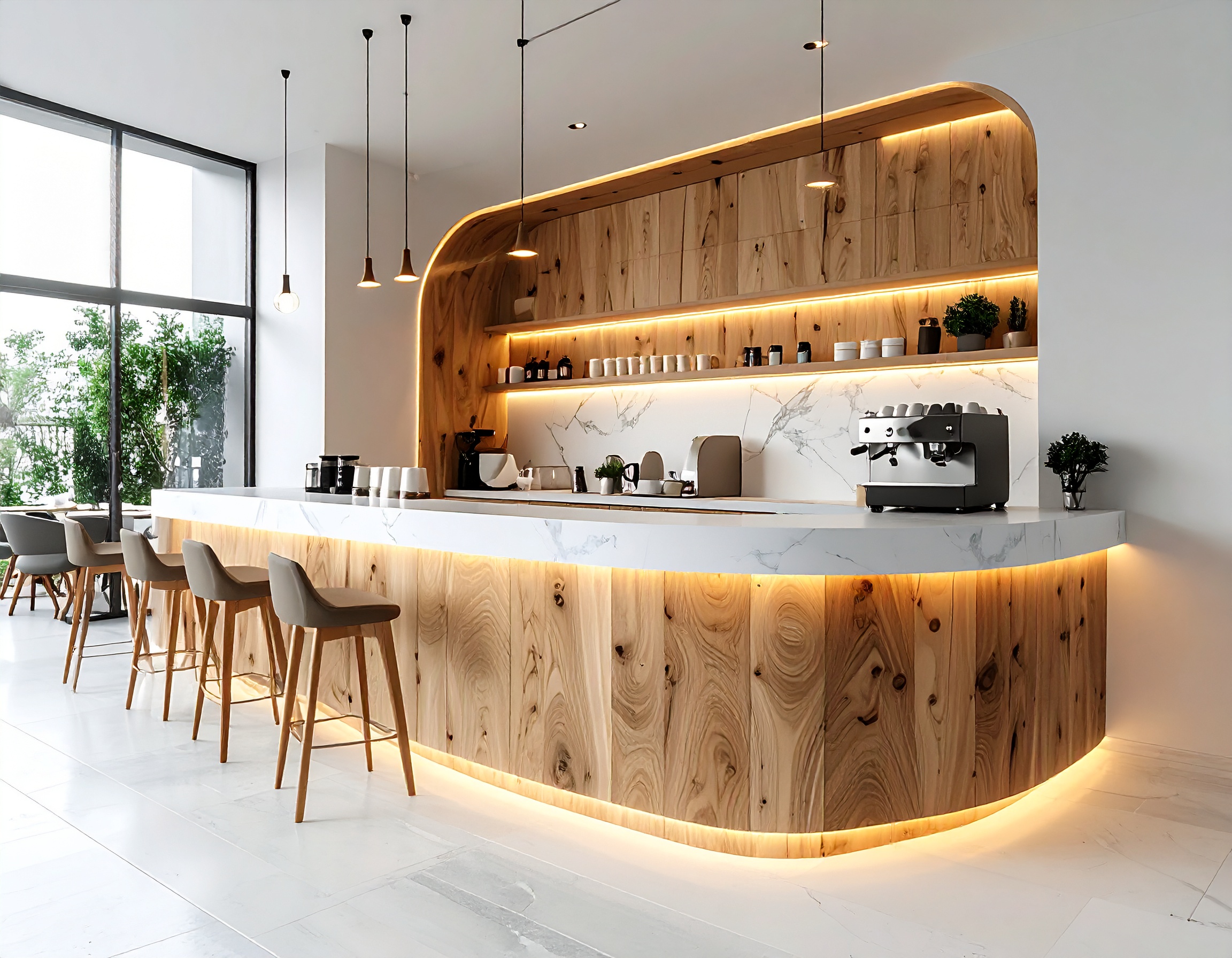 Với quán quy mô lớn, quầy chữ U hoặc quầy bo cong hiện đại mang lại sự chuyên nghiệp và sang trọng. Thiết kế này tạo cảm giác bao quát không gian, giúp khách hàng dễ quan sát quy trình pha chế. Đồng thời, kiểu dáng cong mềm mại còn giúp tổng thể quán trở nên cao cấp hơn.