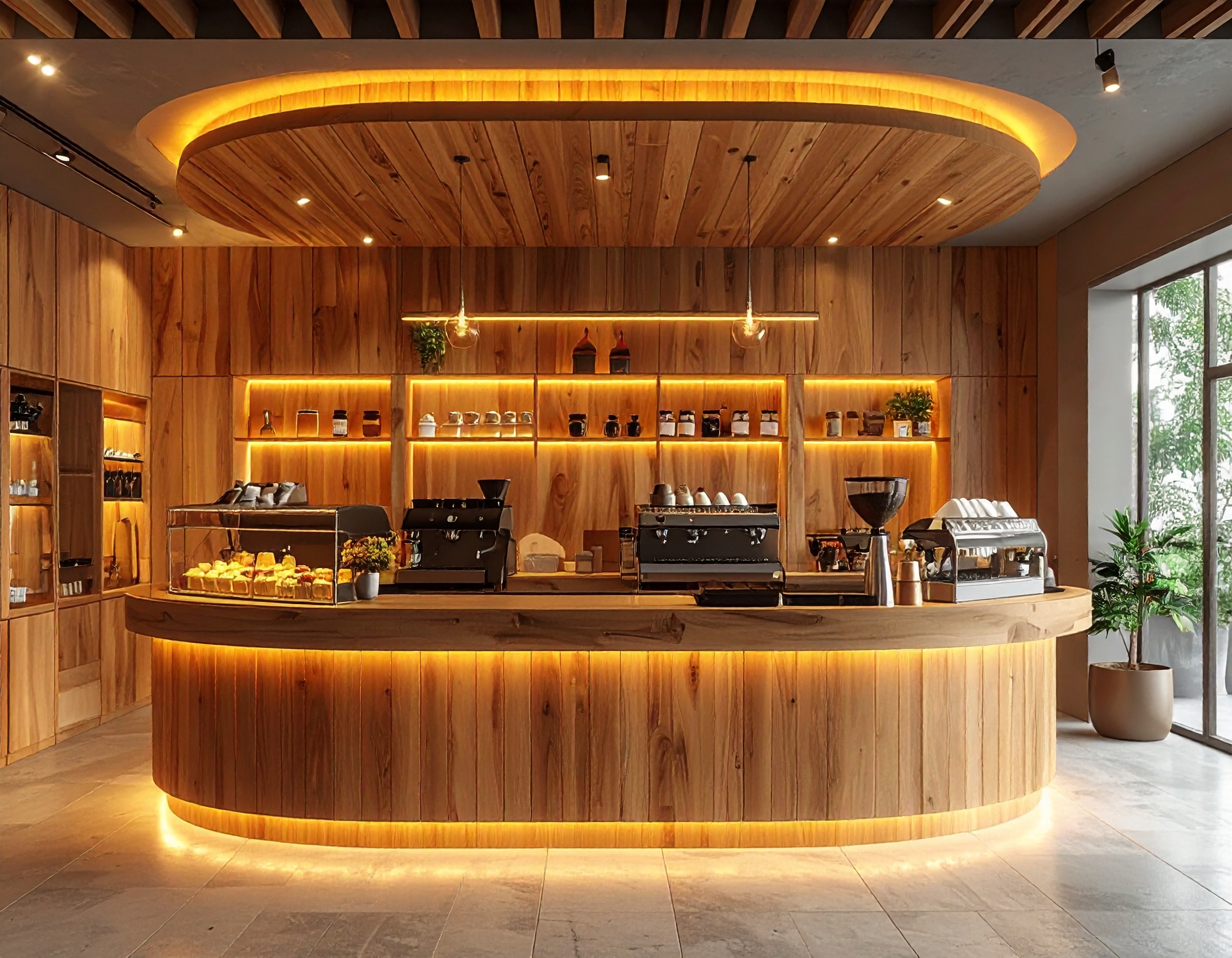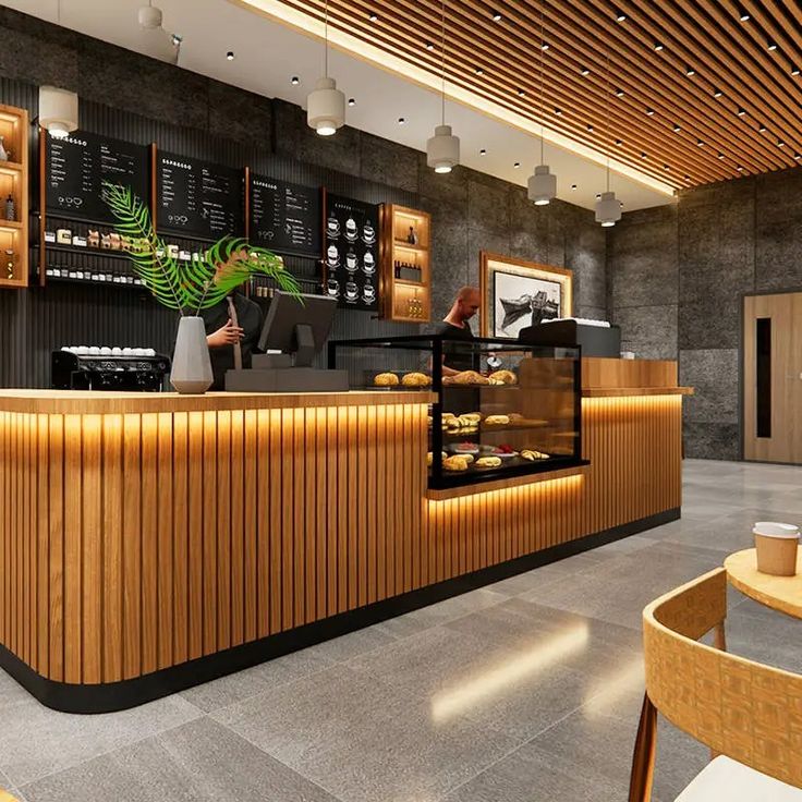 Đối với quán cà phê phong cách hiện đại hoặc chuỗi thương hiệu, quầy pha chế gỗ sang trọng nên kết hợp mặt đá sáng màu, hệ đèn LED và logo nổi bật phía trước để tăng nhận diện thương hiệu. Kiểu dáng bo cong hoặc phối lam gỗ trang trí giúp không gian trở nên đẳng cấp hơn.