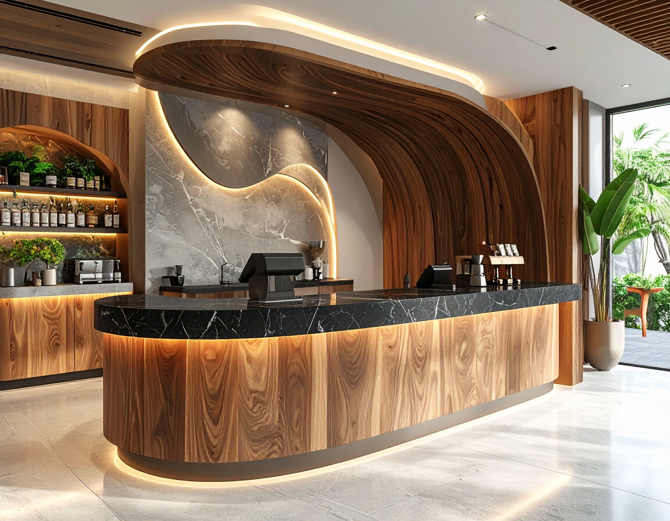 Ngoài ra, xu hướng quầy pha chế bo cong mềm mại cũng đang rất được ưa chuộng. Những đường cong tinh tế giúp không gian trở nên hiện đại và cao cấp hơn. Khi kết hợp cùng hệ đèn LED âm và logo thương hiệu nổi bật, quầy pha chế trở thành điểm nhấn thu hút mọi ánh nhìn.