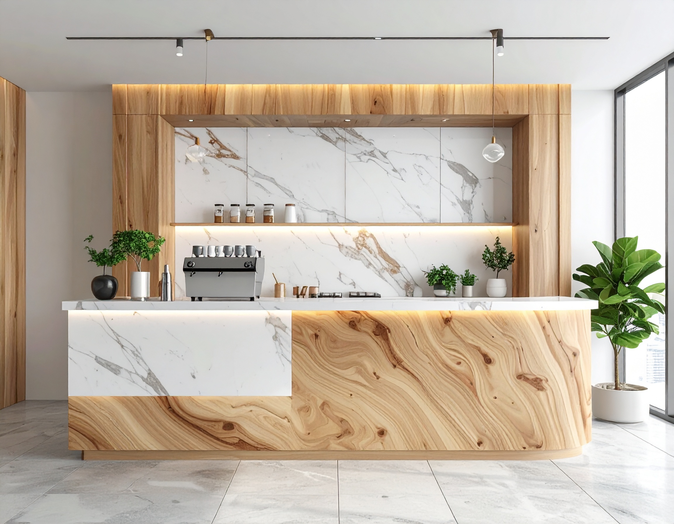 Xu hướng quầy gỗ kết hợp mặt đá hoặc inox ở khu vực pha chế đang được ưa chuộng vì vừa đảm bảo vệ sinh, vừa tăng độ bền cho quầy. Phần mặt ngoài vẫn sử dụng gỗ để giữ tính thẩm mỹ, trong khi phần thao tác tiếp xúc trực tiếp với nước và nguyên liệu được bảo vệ tốt hơn.