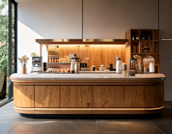 Trước hết là tỷ lệ và hình khối. Chiều cao quầy, độ sâu mặt thao tác, chiều dài khu vực phục vụ phải cân đối với không gian tổng thể. Quầy quá cao sẽ tạo cảm giác nặng nề, quầy quá thấp lại mất đi sự sang trọng. Tỷ lệ chuẩn giúp quầy nhìn gọn gàng, hiện đại và dễ sử dụng.