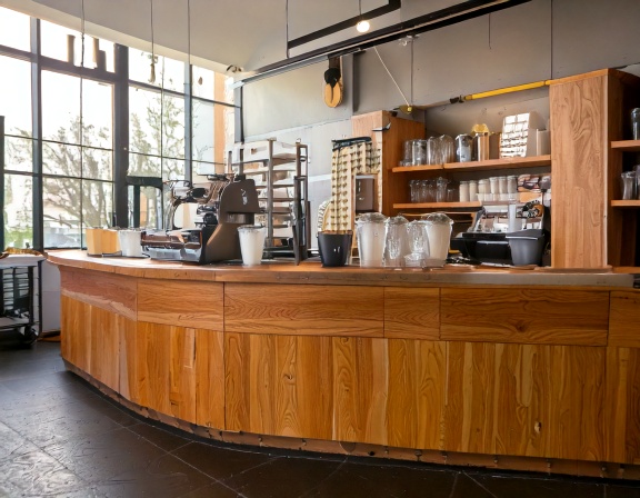 Yếu tố tiếp theo là kết cấu và độ bền. Quầy pha chế thường chịu tải trọng lớn từ máy móc, nguyên liệu và thao tác liên tục, vì vậy khung quầy cần được gia cố chắc chắn, bề mặt phải chịu nước, chịu nhiệt và dễ vệ sinh. Bluecons thường sử dụng các dòng gỗ công nghiệp lõi xanh chống ẩm kết hợp phủ bề mặt chất lượng cao để đảm bảo độ bền trong môi trường quán trà sữa.
