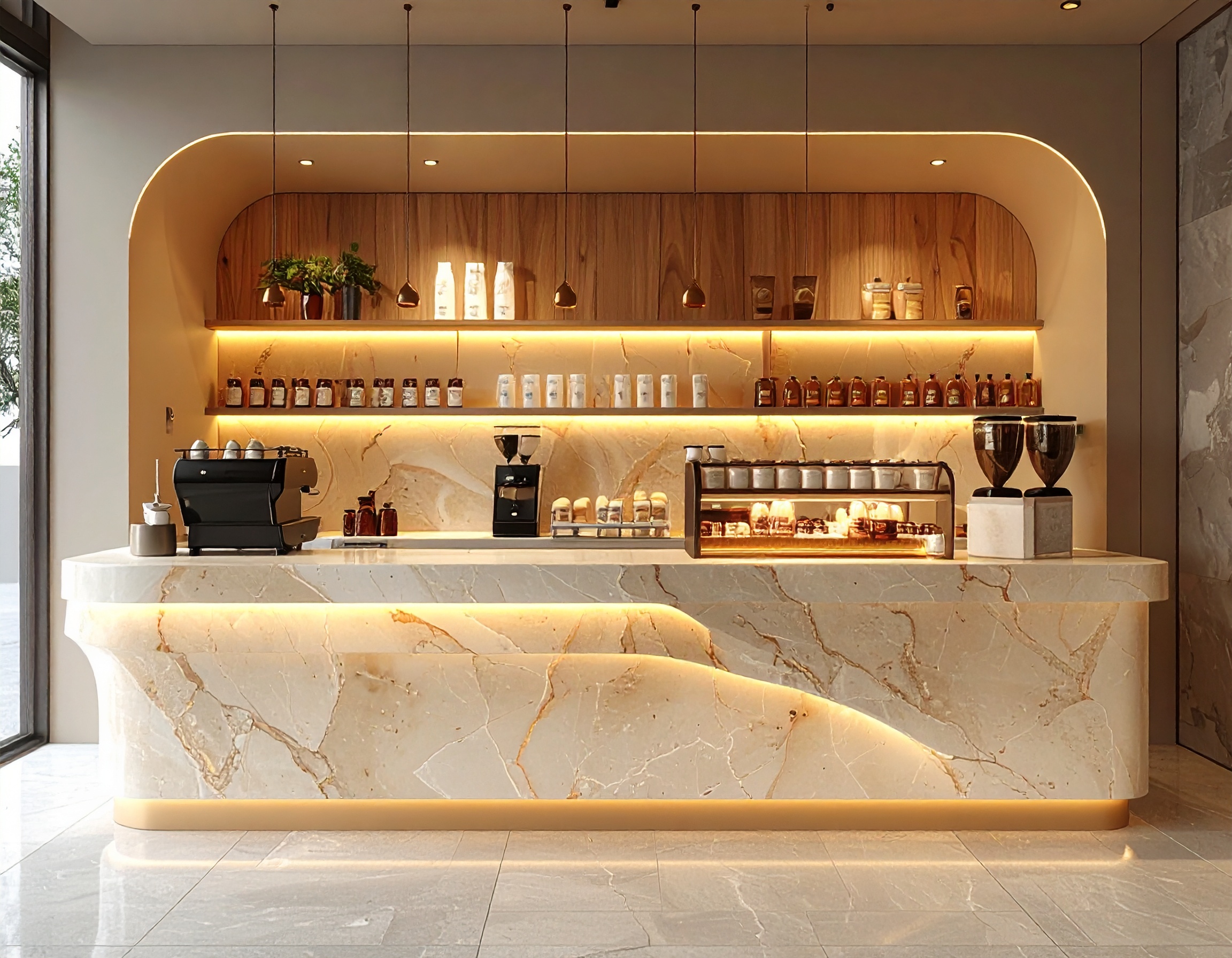 Đối với quán lớn, lưu lượng khách cao, quầy chữ U hoặc quầy kết hợp đảo pha chế giúp tối ưu quy trình làm việc cho nhiều nhân sự. Tuy diện tích chiếm dụng lớn hơn nhưng nếu được thiết kế chuẩn, quầy vẫn tạo cảm giác gọn gàng, chuyên nghiệp và tăng năng suất rõ rệt.