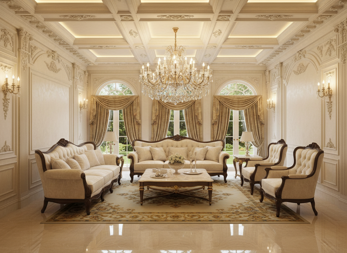 Tân cổ điển là sự kết hợp giữa nét đẹp cổ điển sang trọng và hơi thở hiện đại. Thi công nội thất theo phong cách này thường sử dụng các chi tiết phào chỉ, hoa văn tinh tế, vật liệu gỗ tự nhiên, đá marble, ánh sáng vàng ấm tạo cảm giác đẳng cấp và quý phái.