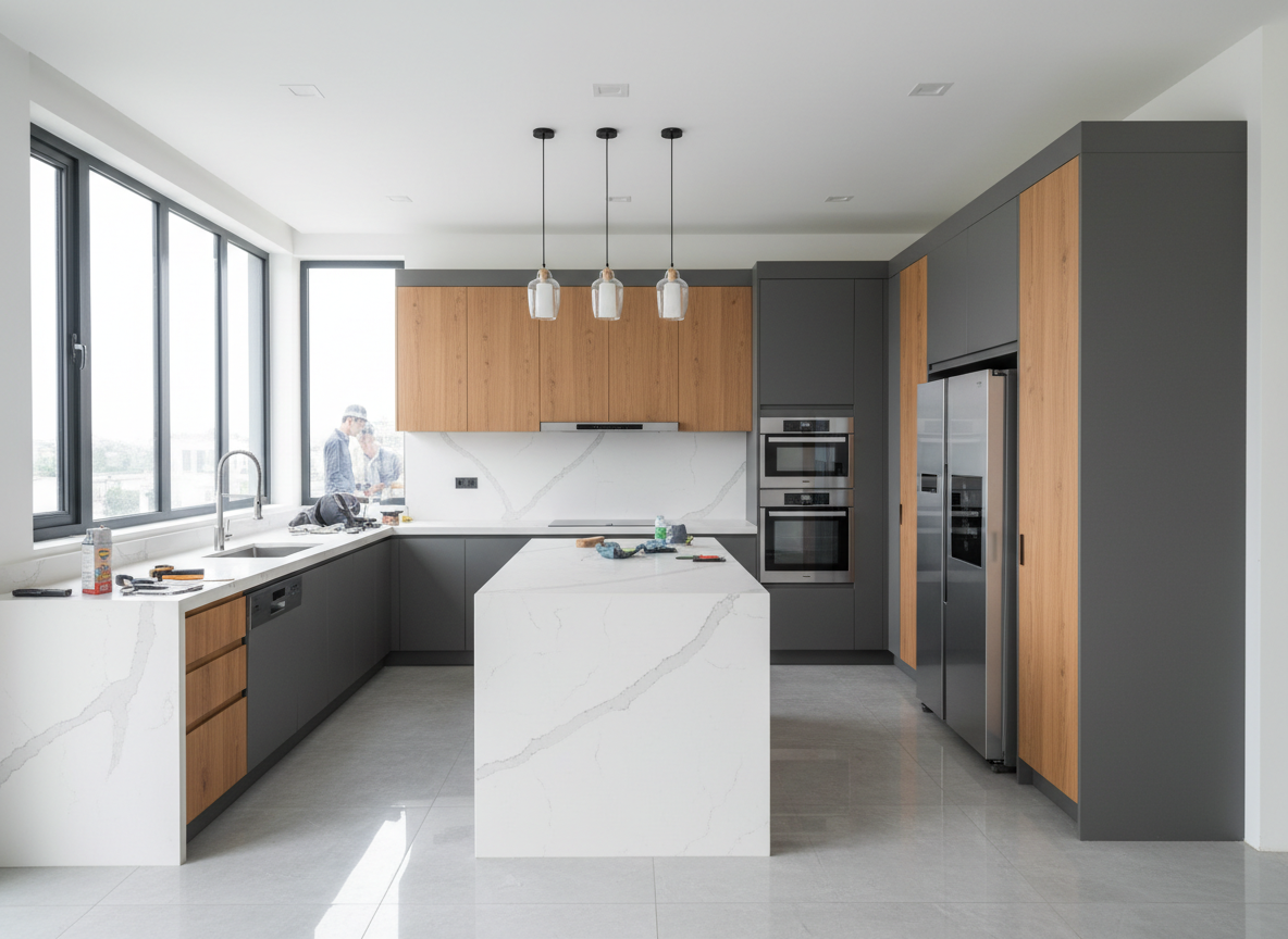 Thi công bếp biệt thự không chỉ đẹp mà còn phải chuẩn công năng – chuẩn an toàn – bền trong môi trường nhiệt và độ ẩm cao.